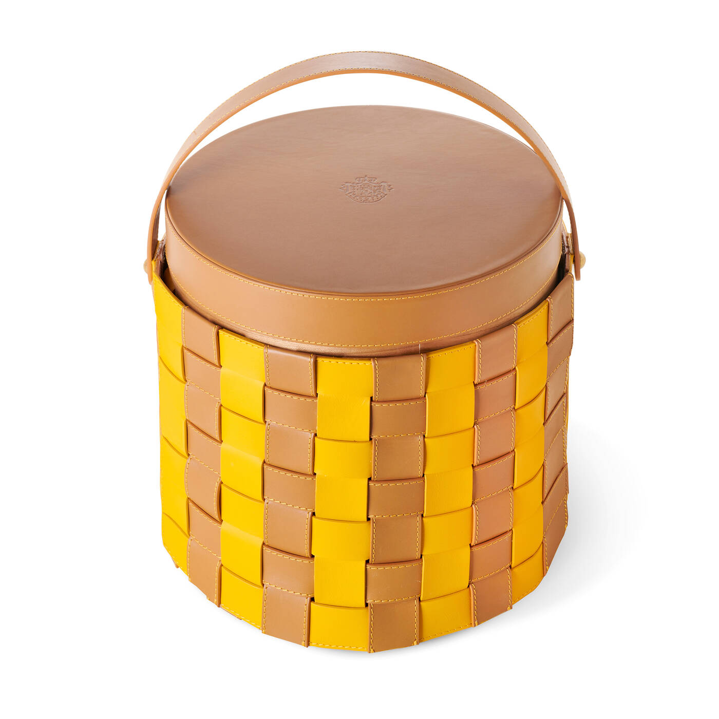 Die ineinandergreifenden Streifen auf der Außenseite sind mit einem glatten, runden Deckel aus hellbraunem Kalbsleder kombiniert, der mit gelben Präzisionsnähten und dem heißen Stempel der Blasonierung von Acqua di Parma in der Mitte verziert ist. Die Unterseite des Deckels nimmt vier Art de la Table-Servietten auf und sorgt dafür, dass die Eleganz nie beeinträchtigt wird.