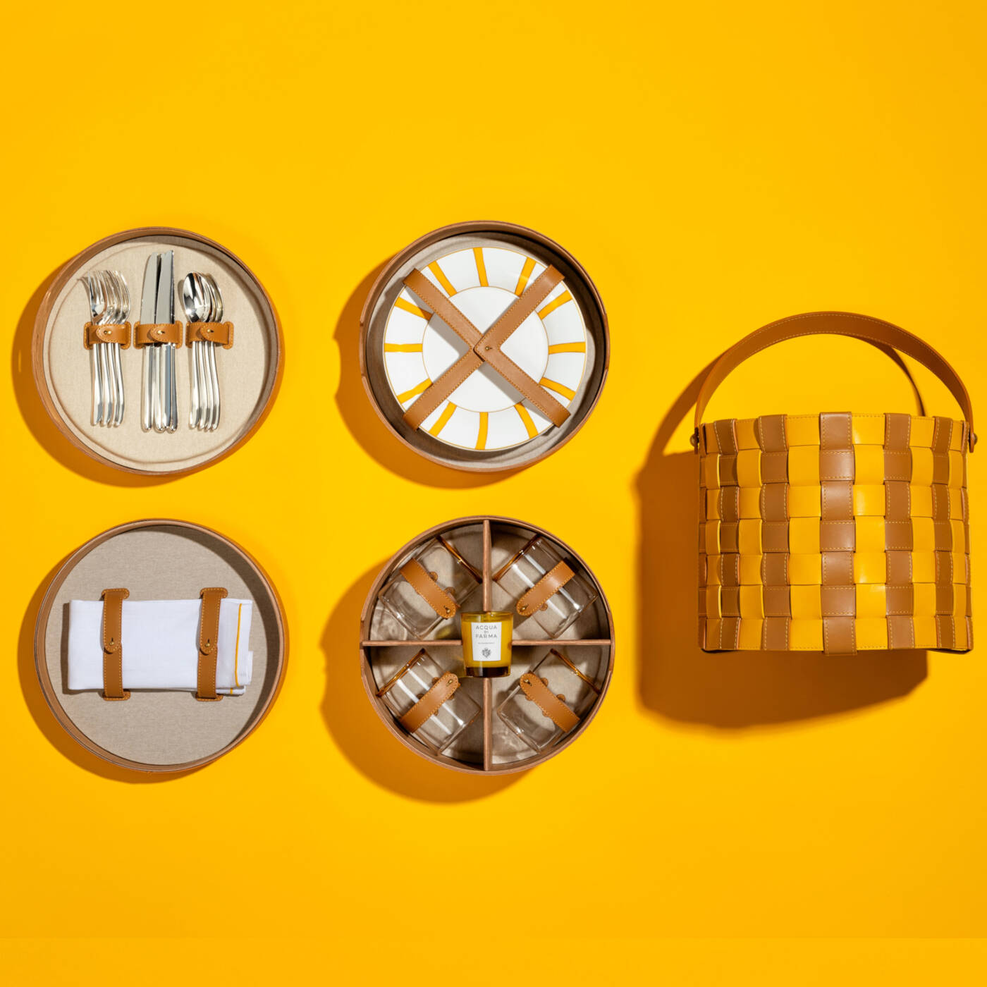 "Der Buongiorno Picknickkorb besteht aus einem eleganten, geflochtenen Lederkorb in den charakteristischen, leuchtenden Gelb- und Brauntönen von Acqua di Parma und ist Ausdruck der italienischen Lebenskunst im Freien.