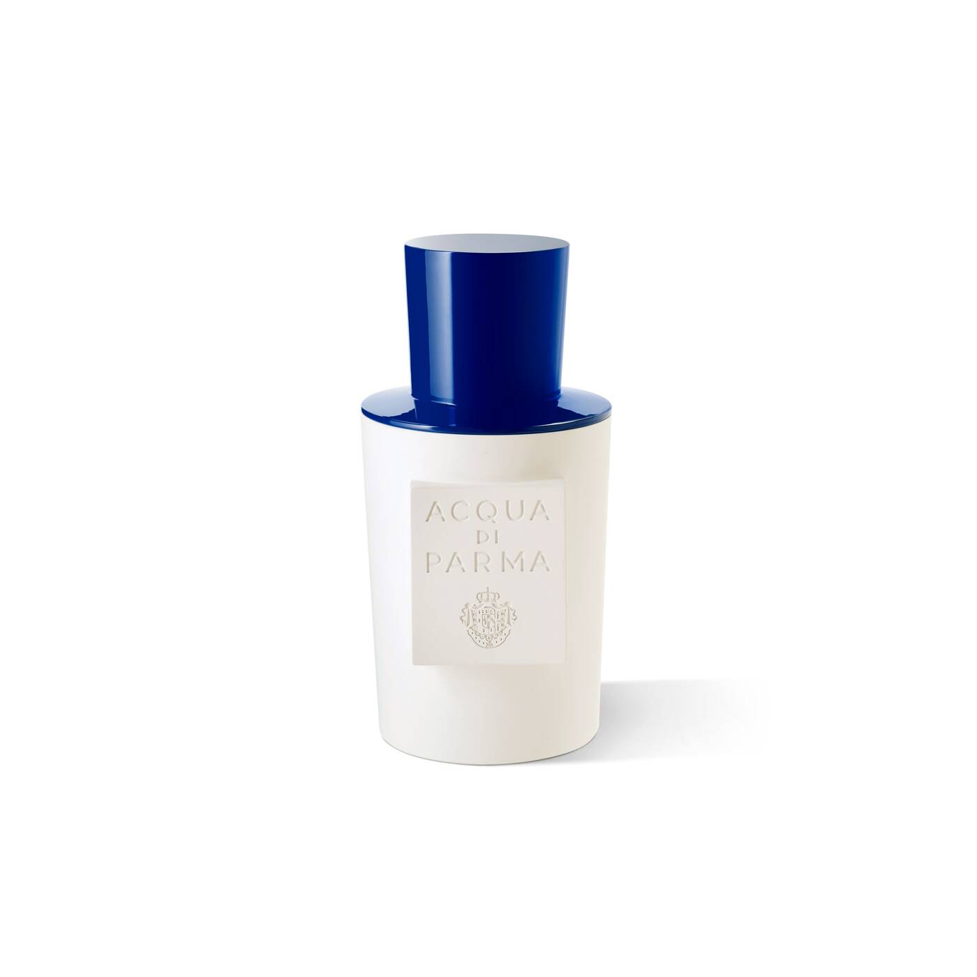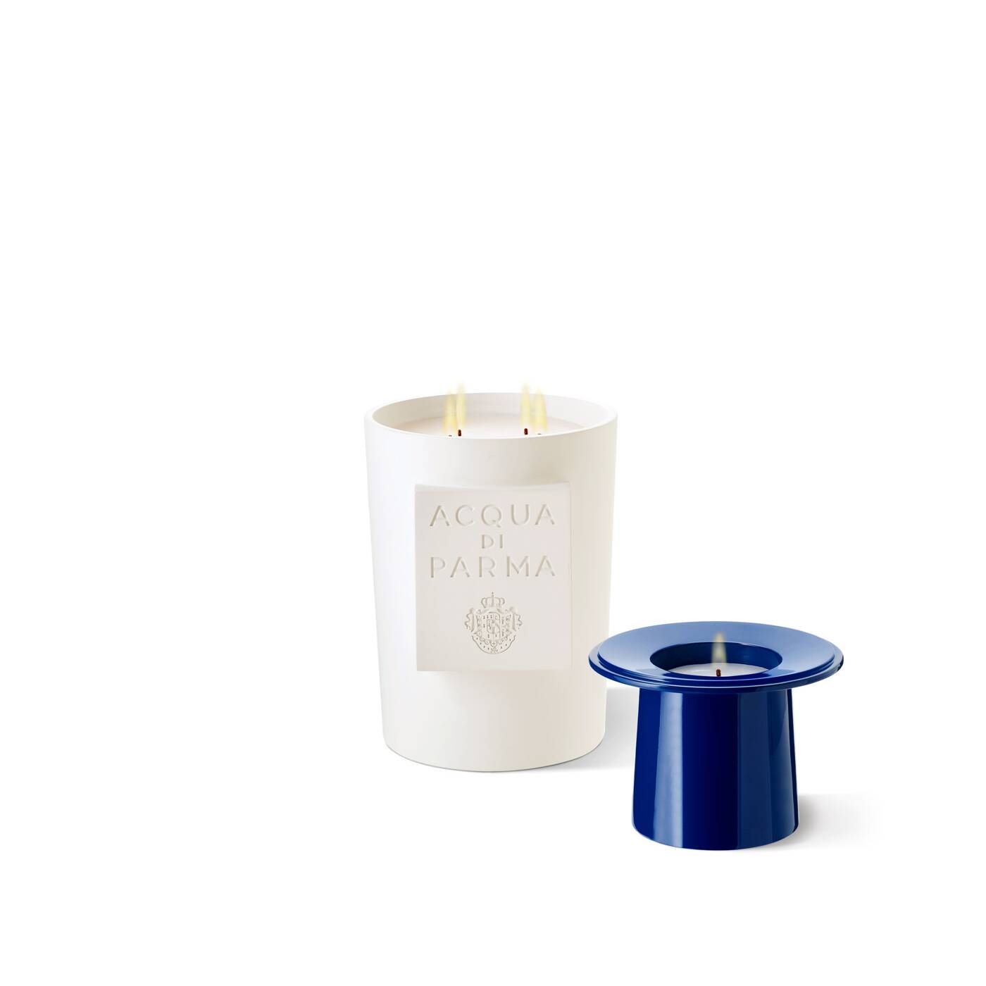 Dieser Art-Déco-Flakon enthüllt gleich zwei Kerzen: Der aus glasiertem Steingut gefertigte Deckel birgt eine tiefblaue, eindochtige Kerze mit einem Gewicht von 330 Gramm; während sich im handgefertigten Keramikunterteil des Flakons eine zweite 1.600 Gramm schwere Kerze versteckt, die dank ihrer vier Dochte das reine und klare Design ihrer charakteristischen Form beibehält und ein gleichmäßiges und weitläufiges Licht abgibt. Dieses Zusammenspiel von Strukturen und Oberflächen unterstreicht nicht nur das technische Know-how, sondern verspricht auch eine unbestreitbare visuelle und haptische Faszination. Das mit äußerster Sorgfalt gefertigte Unterteil wird zunächst mit Hilfe der sogenannten „Biskuitbrand“-Technik gefertigt, bei der eine unglasierte Rohkeramik nach der Formgebung und dem Aushärten im Ofen in einem minutiösen Prozess, der bis zu 30 Minuten lang dauert, glattgeschliffen wird und auf diese Weise ihre ursprünglichen haptischen Eigenschaften bewahrt. Das Ergebnis ist eine einzigartige matte Oberfläche mit einem nuancierten Design. Sie bildet einen schönen Kontrast zum Deckel, der erst glasiert und dann gebrannt wird. Um die Lebendigkeit des blauen Farbtons zu gewährleisten, wird eine weitere Schicht Glasur aufgetragen, bevor das Stück erneut gebrannt wird. Dies führt zu einer glänzenden, elegant anmutenden Oberfläche, die das umso bescheiden anmutende Unterteil perfekt ergänzt. Das erhabene, handgeprägte Logo auf jeder Kerze ist eine moderne Neuinterpretation des unverkennbaren Wappens von Acqua di Parma. Die manuelle Veredelung des Deckels und das von Hand eingefüllte Wachs zeugen von einer präzisen und modernen Produktion in Kombination mit der Raffinesse handwerklicher Vollendung.