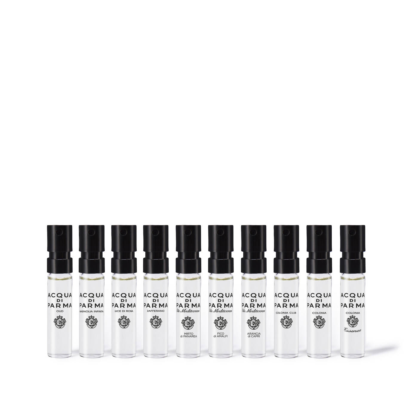 Ein Parfümset mit einer Auswahl von 10 der beliebtesten Düfte der Maison: Colonia, Colonia Essenza, Colonia C.L.U.B., Arancia di Capri, Fico di Amalfi, Mirto di Panarea, Luce di Rosa, Zafferano, Magnolia Infinita und Oud.