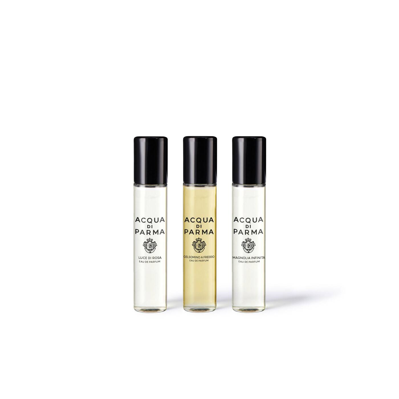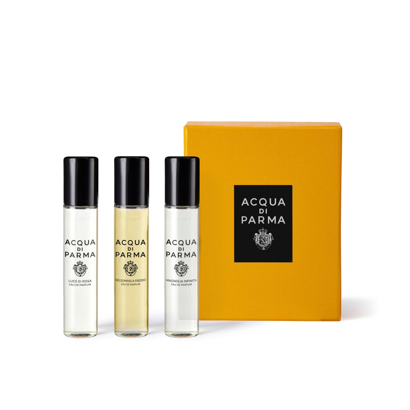 „Ein Entdeckungsset mit drei 12-ml-Fläschchen Eau de Parfum aus der Komposition „Luminous Signatures of the Sun“ – Luce di Rosa, Gelsomino a Freddo und Magnolia Infinita – präsentiert in einer charakteristischen gelben Schachtel mit schwarzem Etikett.