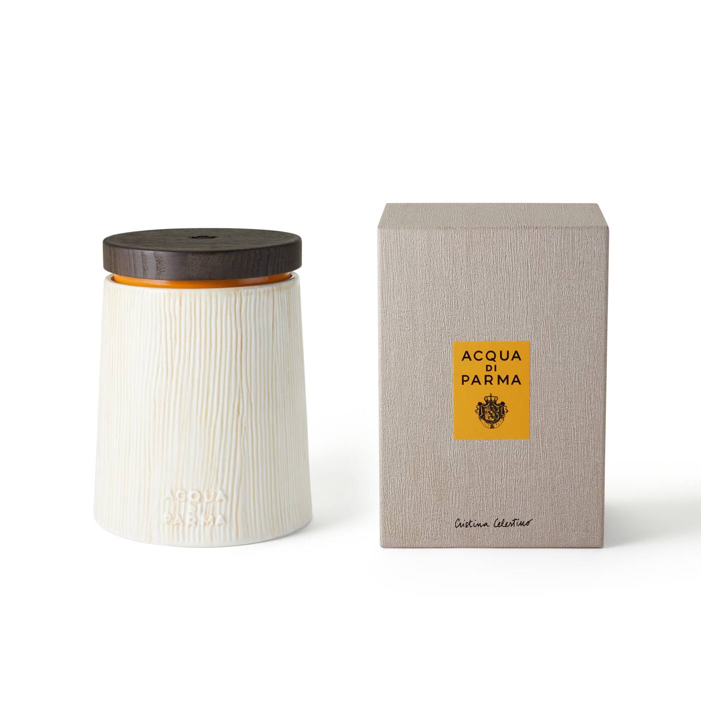 Der strukturierte Pennellato-Effekt, der an die handbemalten Stuben traditioneller Alpeninterieurs erinnert, verleiht dem Objekt eine vertikale Struktur. Der dunkle Holzdeckel, der ton-in-ton mit dem Acqua di Parma-Wappen graviert ist, dient sowohl als Deckel als auch als Sockel für die Präsentation. Im Inneren kommt ein glatter gelber Porzellaneinsatz mit der Signatur von Cristina Celestino zum Vorschein.