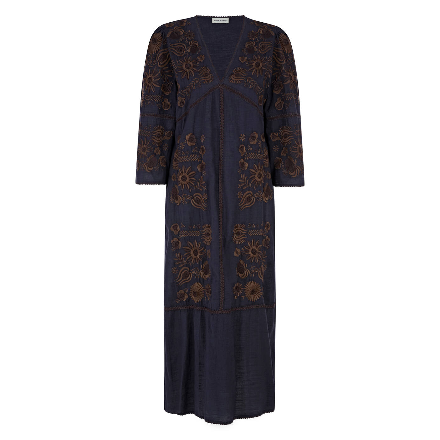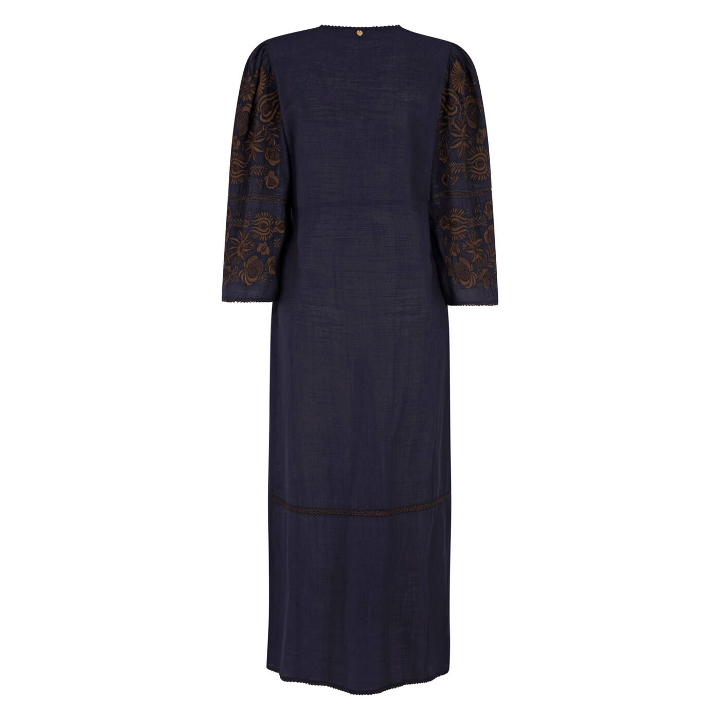 Florale Stickereien in warmem Braun auf Oberteil und Ärmeln