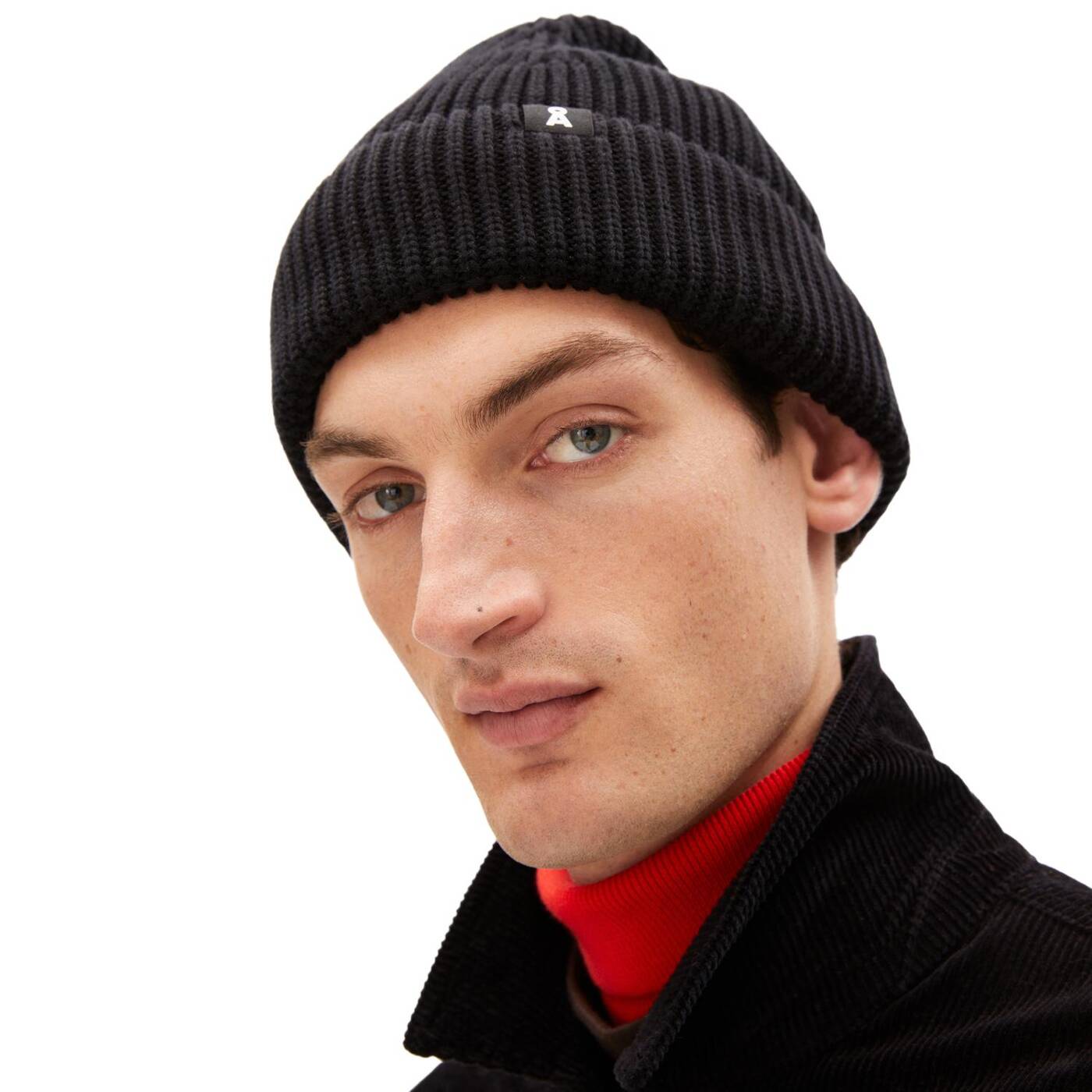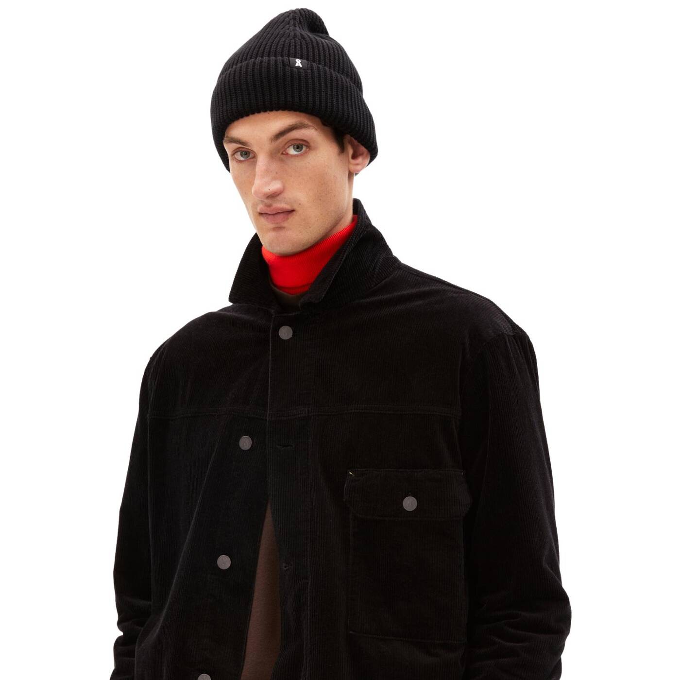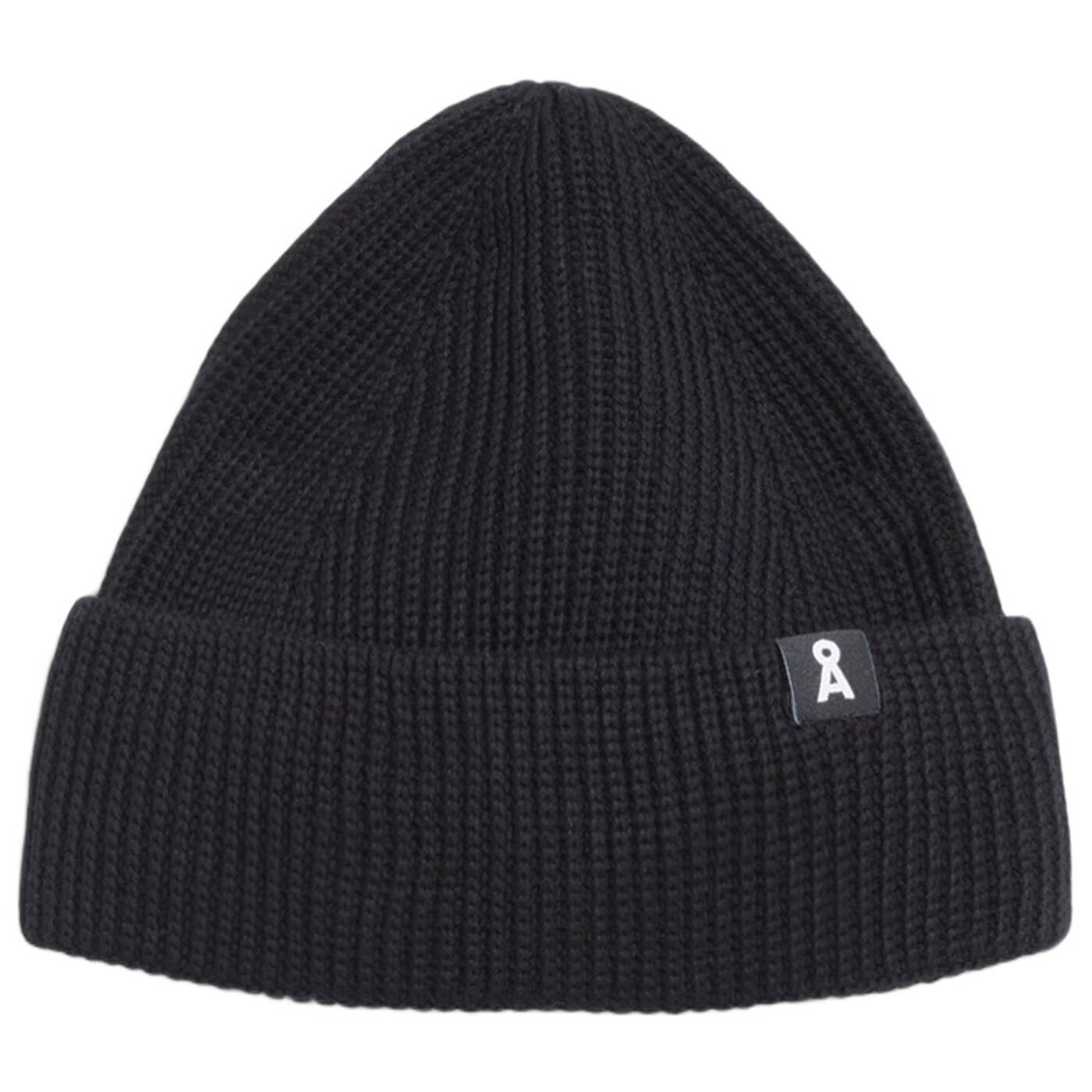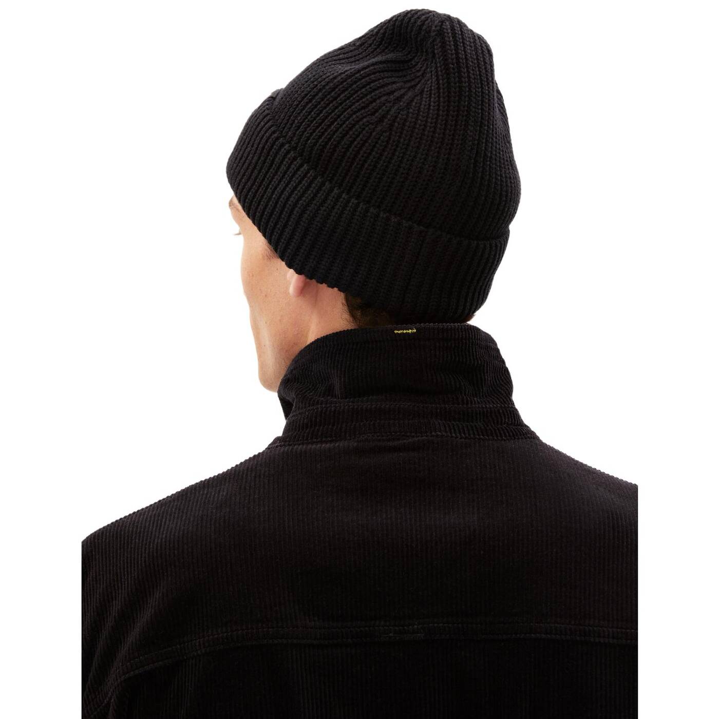 Die Mütze hat einen gerollten Saum, der bequem auf den Kopf passt. Auf der rechten Seite befindet sich das kleine Armedangels Logo, das auf einem quadratischen weißen Hintergrund platziert ist.