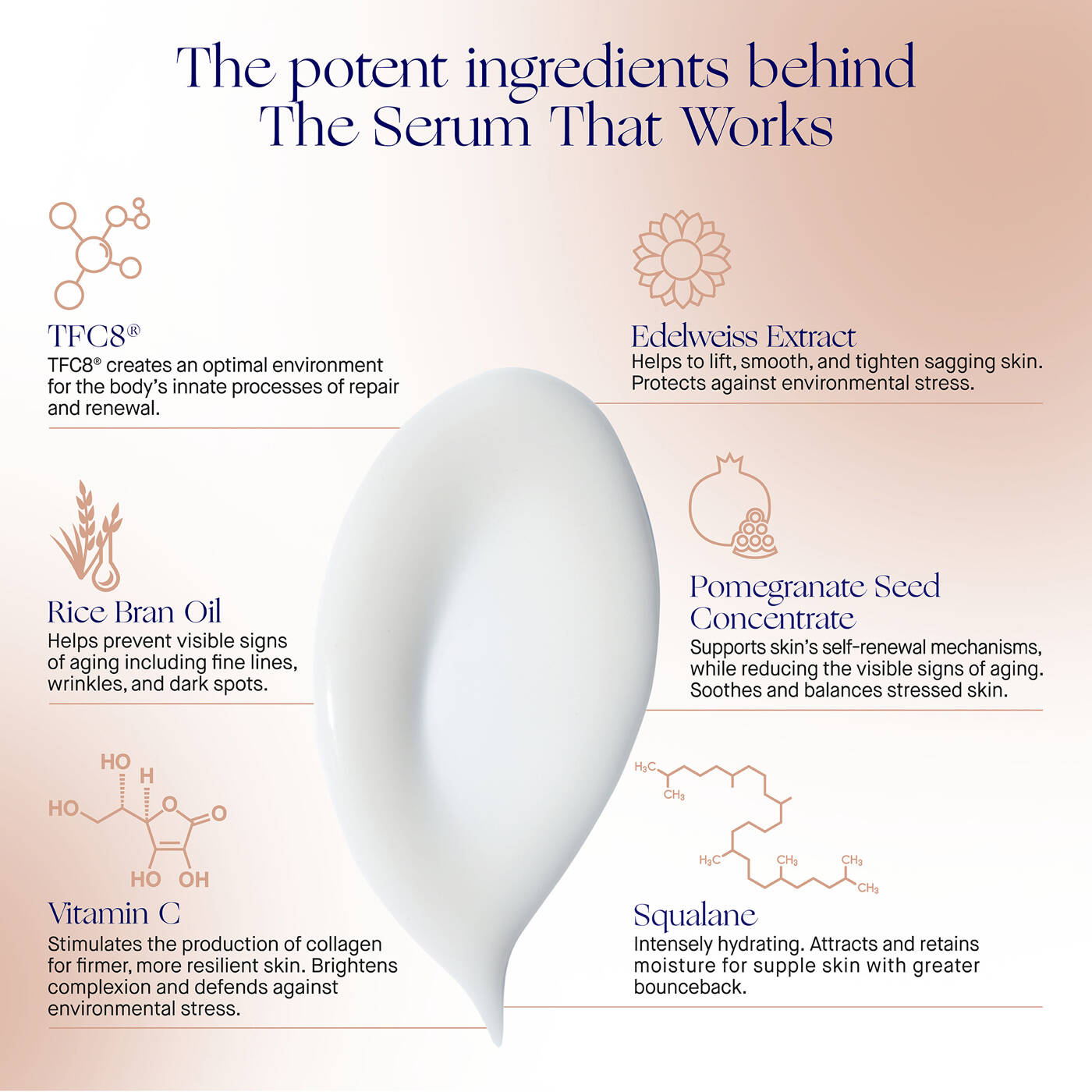Unterstützt von TFC8® - unserer Mischung aus Aminosäuren, hochwertigen Vitaminen und synthetisierten Molekülen wird die Haut mit Nährstoffen versorgt und unterstützt körpereigene Erneuerungsprozesse.