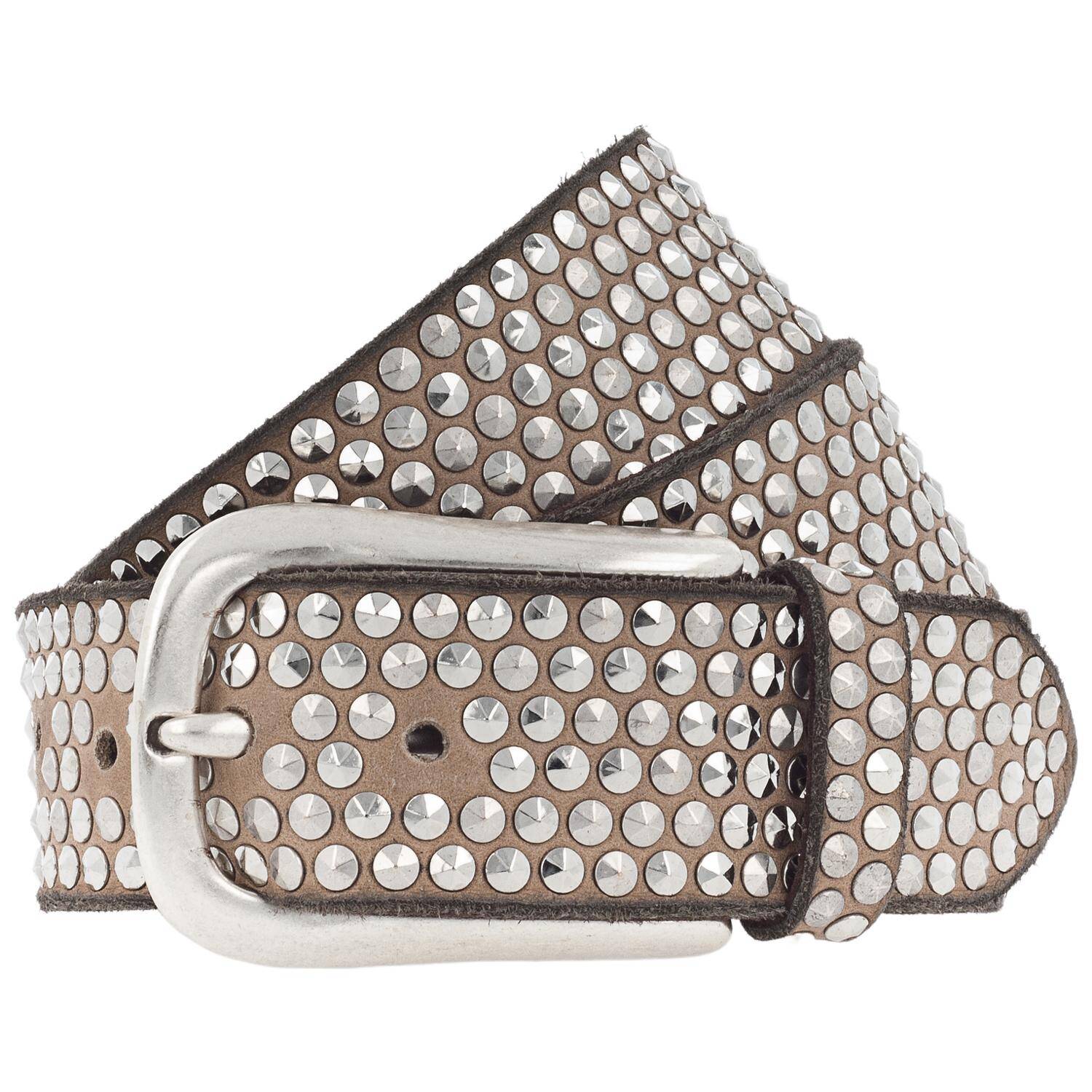 Der Vollrindleder-Nietengürtel ist 35 mm breit, mit matten und glänzenden silbernen Diamantnieten und einer geschwungenen Dornschließe in mattem Silber verziert. Das Material ist ein weiches, mit sich selbst kaschiertes Vollrindleder mit dezenter Narbung und matter Oberfläche. Dieser Gürtel ist die ideale Ergänzung zu allen Freizeit-Outfits und garantiert einen femininen und anspruchsvollen Look. Handmade in Germany. Die vollständige Fertigung im B.BELT-Headquarter, am Modestandort Metzingen beim Familienunternehmen Bazlen, garantiert ein nachhaltig hergestelltes Produkt.