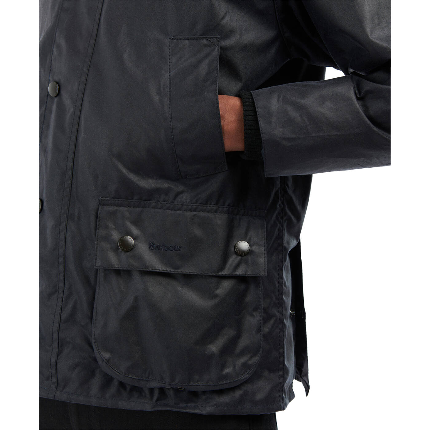 Charakteristische Merkmale sind der Zwei-Wege-Reißverschluss mit Druckknopfblende, zwei große Blasebalg-Taschen und zwei mit Moleskin gefütterte Schubtaschen, die zusammen mit dem Cordkragen einen markanten Look schaffen. Rippstrickbündchen an den Ärmelenden vervollständigen das Design. Wachsjacken sind robuste und langlebige Kleidungsstücke, die bei Bedarf nachgewachst werden können, um ihre wasserabweisenden Eigenschaften zu erhalten.