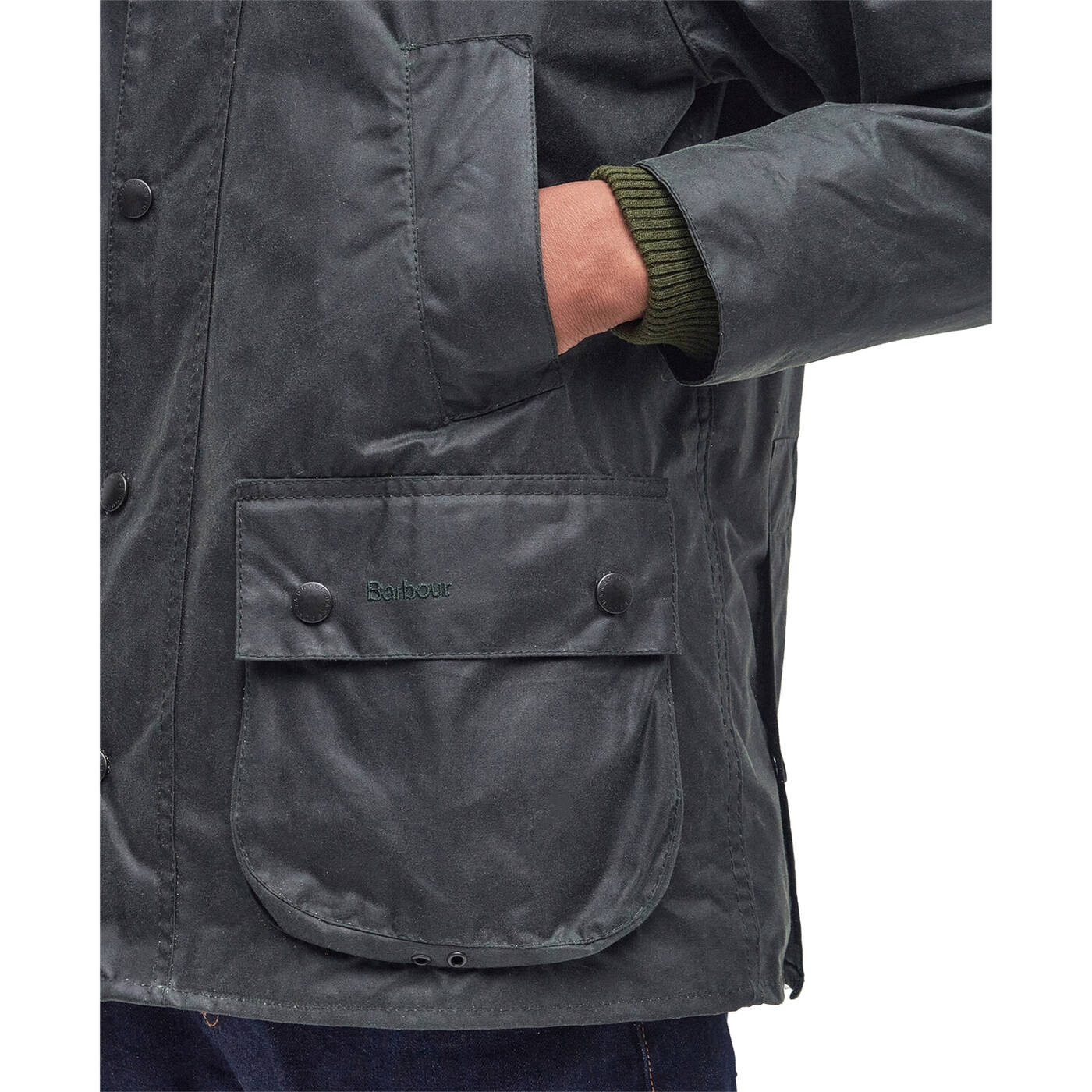 Charakteristische Merkmale sind der Zwei-Wege-Reißverschluss mit Druckknopfblende, zwei große Blasebalg-Taschen und zwei mit Moleskin gefütterte Schubtaschen, die zusammen mit dem Cordkragen einen markanten Look schaffen. Rippstrickbündchen an den Ärmelenden vervollständigen das Design. Wachsjacken sind robuste und langlebige Kleidungsstücke, die bei Bedarf nachgewachst werden können, um ihre wasserabweisenden Eigenschaften zu erhalten.