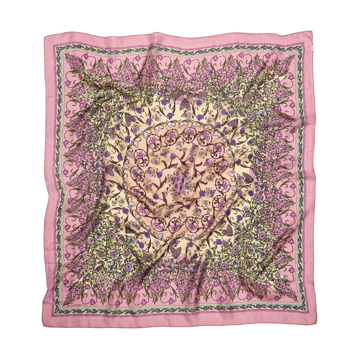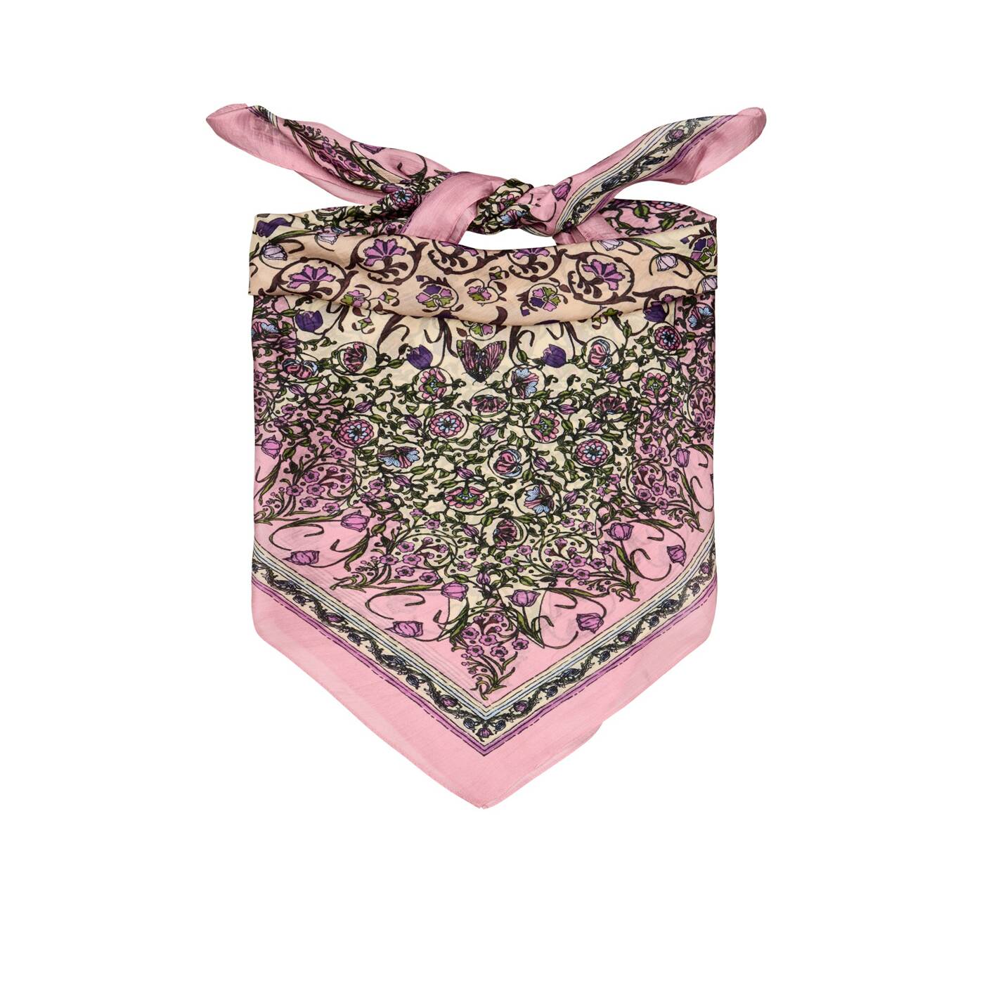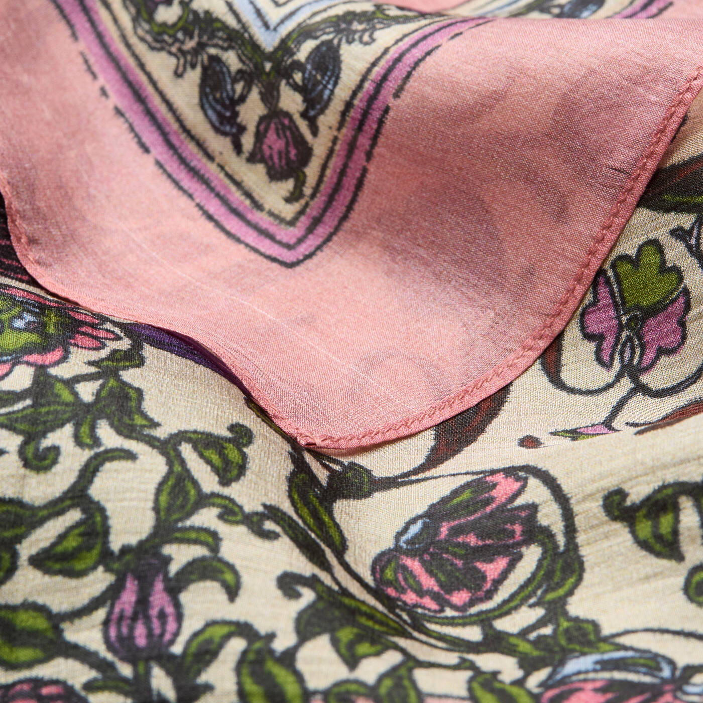 Ein quadratischer Schal (100 x 100 cm) aus 100 % Taby-Seide. Das florale Muster verleiht ihm einen zarten, femininen Look und ist in drei Farben erhältlich. Die Seide fühlt sich leicht auf der Haut an und lässt sich vielseitig stylen: als Halstuch, im Haar oder an der Tasche.