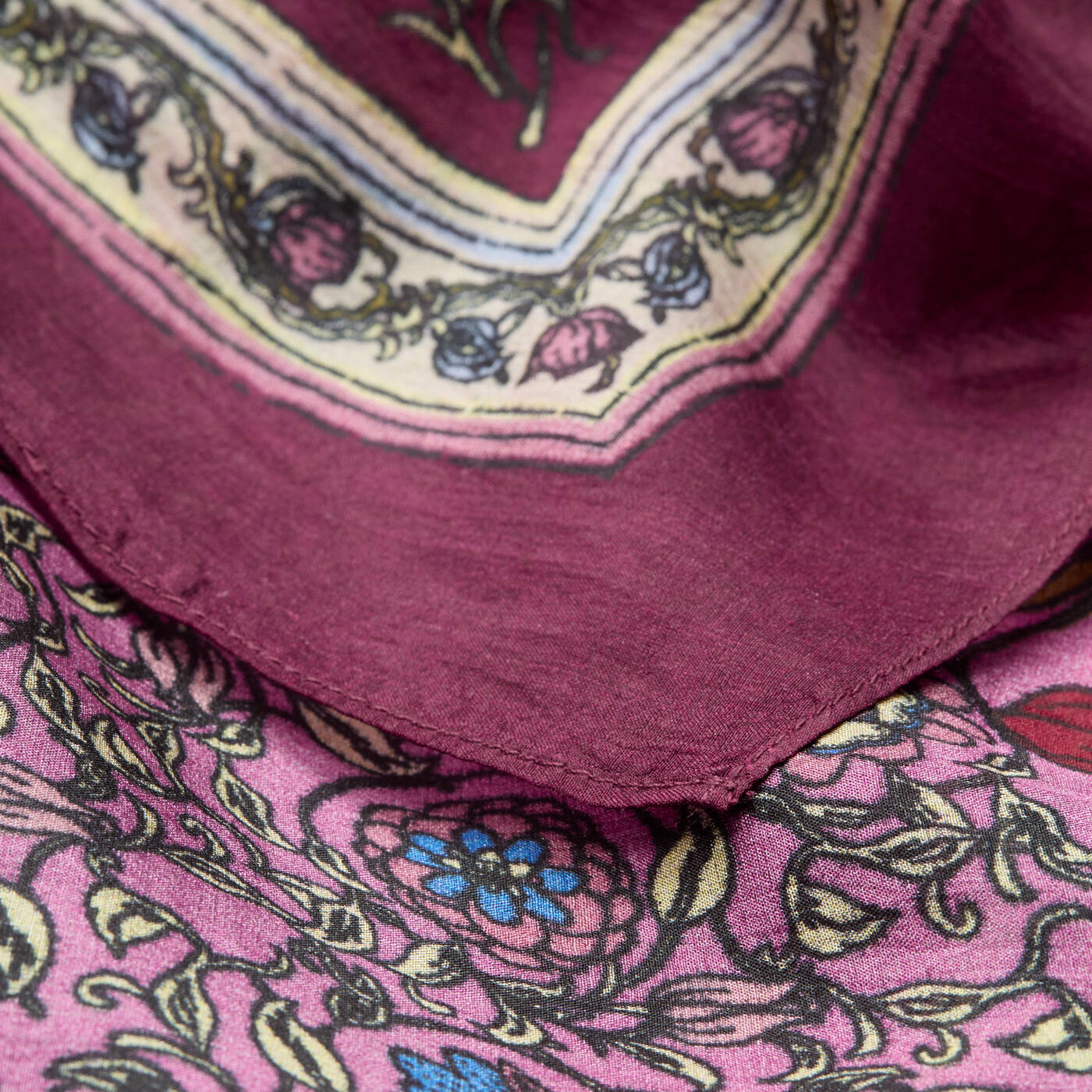 Ein quadratischer Schal (100 x 100 cm) aus 100 % Taby-Seide. Das florale Muster verleiht ihm einen zarten, femininen Look und ist in drei Farben erhältlich. Die Seide fühlt sich leicht auf der Haut an und lässt sich vielseitig stylen: als Halstuch, im Haar oder an der Tasche.