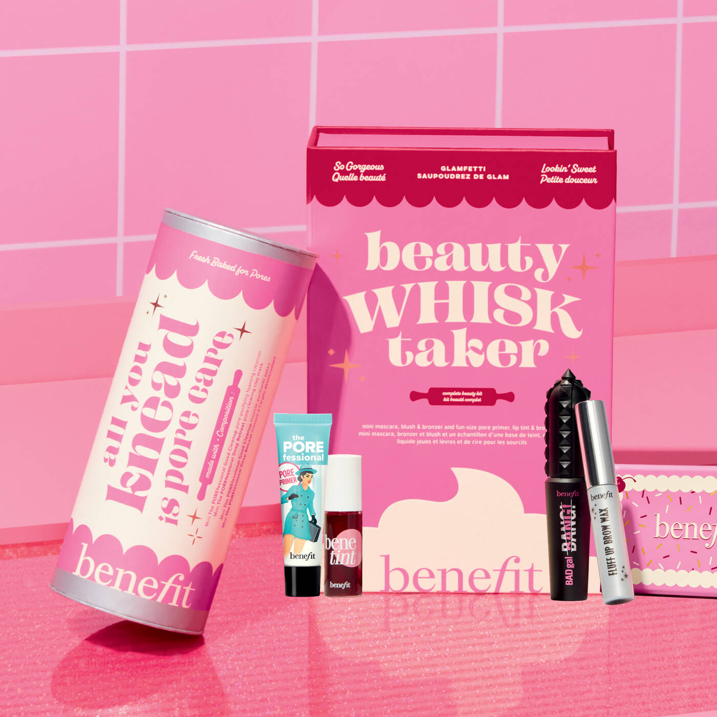 Das Weihnachts-Beauty-Set Beauty Whisk Taker von Benefit Cosmetics enthält Mascara, Bronzer, Primer, Blush, Tint, Augenbrauenwachs und Reinigungsöl. Sei bereit für DAS Rezept dieser Weihnachtszeit. Beginne mit einer glatten Basis, indem du das Erscheinungsbild der Poren mit dem #1 Primer, dem The POREfessional Pore Primer, minimierst. Mische die Minis von BADgal BANG! Mascara, Hoola Bronzer, und Willa Rouge unter für extra intensive Wimpern und Wangen. Füge die Lippen- und Wangenfarbe Benetint für einen rosigen Teint hinzu und Fluff Up Brow Wax für perfekt gestylte Augenbrauen. The icing on the cake? Eine Probe des The POREfessional Get Unblocked Reinigungsöls. Noch nie war Glam so einfach!