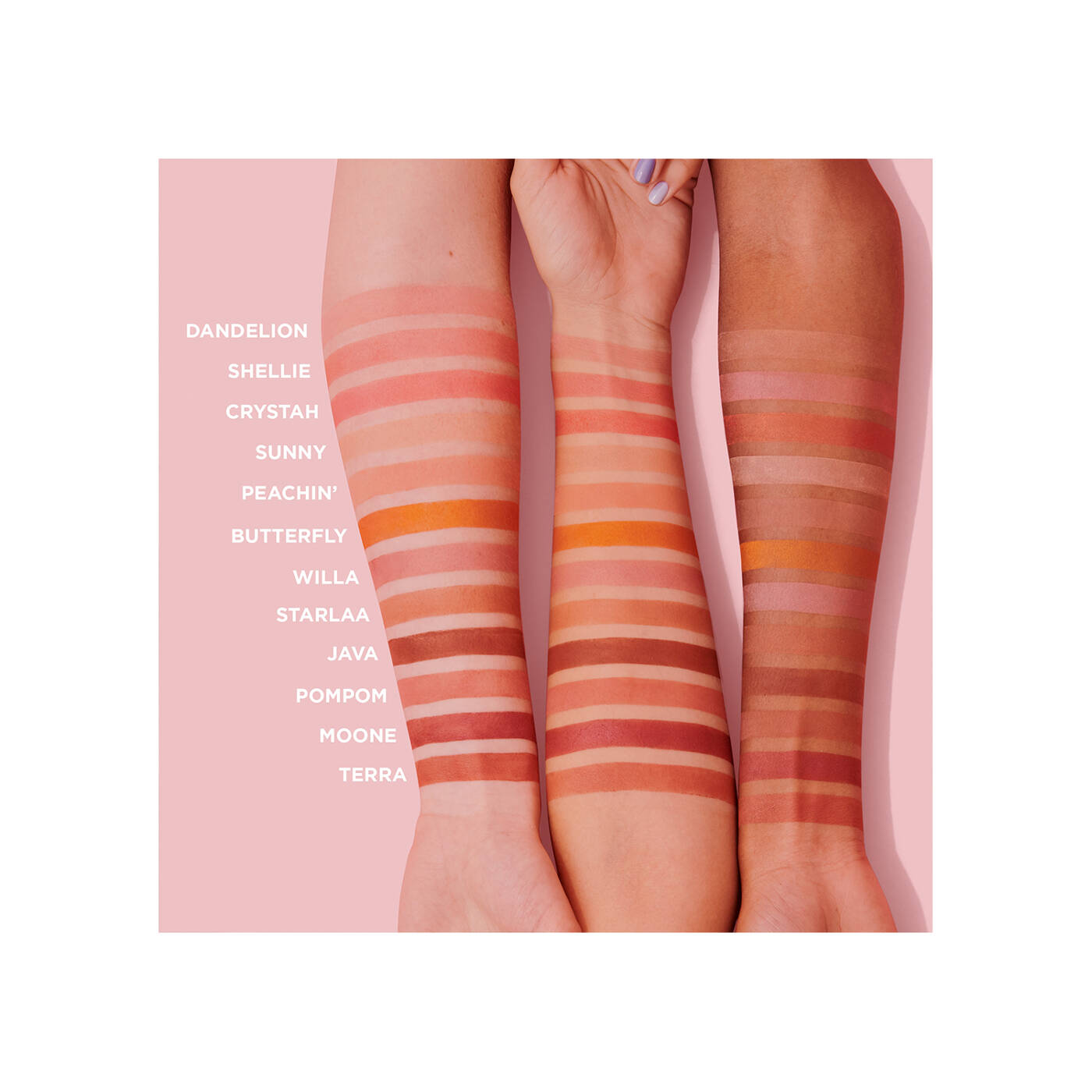 SYNTHETIC FLUORPHLOGOPITE, ZINC STEARATE, MICA, LAURYL DIMETHICONE, PENTAERYTHRITYL TETRAISOSTEARATE, ALUMINA, VINYL DIMETHICONE/METHICONE SILSESQUIOXANE CROSSPOLYMER, DIMETHICONE/VINYL DIMETHICONE CROSSPOLYMER, CAPRYLYL GLYCOL, ETHYLHEXYLGLYCERIN, DEHYDROACETIC ACID, PARFUM (FRAGRANCE), TRIETHOXYCAPRYLYLSILANE, PEARL POWDER, STEARIC ACID, LAURETH-4, AQUA (WATER), TIN OXIDE, TOCOPHEROL. [+/- CI 77491 (IRON OXIDES), CI 77891 (TITANIUM DIOXIDE), CI 15985 (YELLOW 6 LAKE), CI 15850 (RED 7 LAKE)].