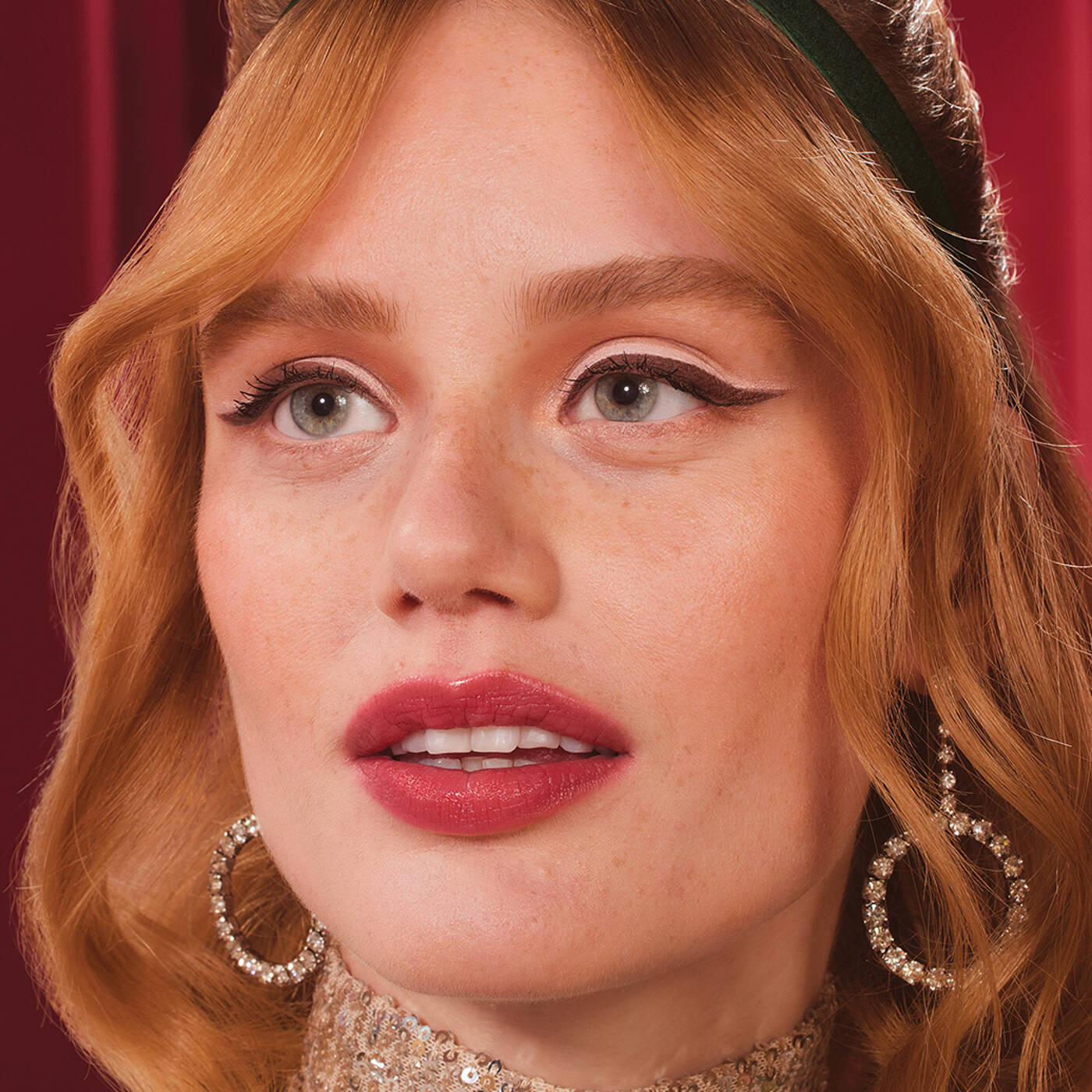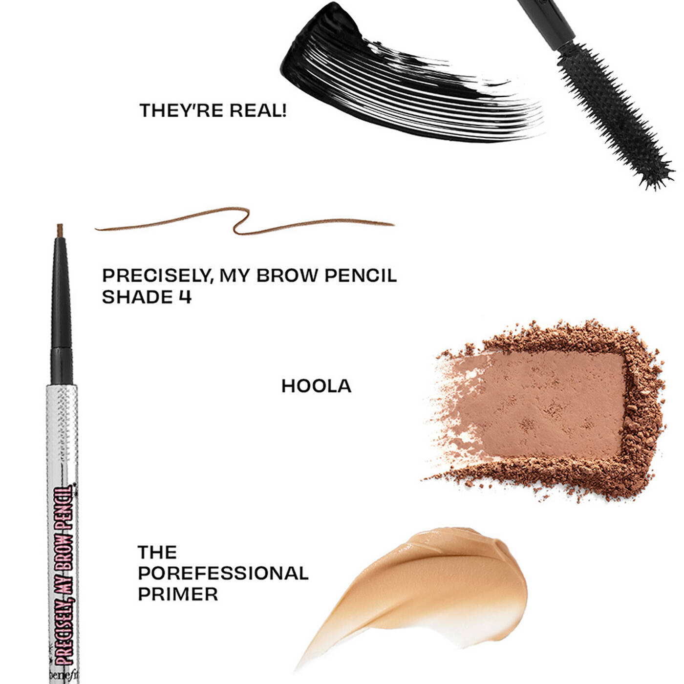 The POREfessional Primer mit den Fingerspitzen über das ganze Gesicht verteilen, um das Aussehen der Poren zu minimieren. Den Precisely, My Brow Pencil mit leichten, kurzen, haarähnlichen Strichen auf die Augenbrauen auftragen und mit dem Spoolie verblenden. Verwende den Hoola Bronzer auf dem ganzen Gesicht für einen natürlich aussehenden gebräunten Look. Ziehe die They're Real! Mascara vom Ansatz bis zu den Spitzen durch die Wimpern für einen festlichen Augenaufschlag.
