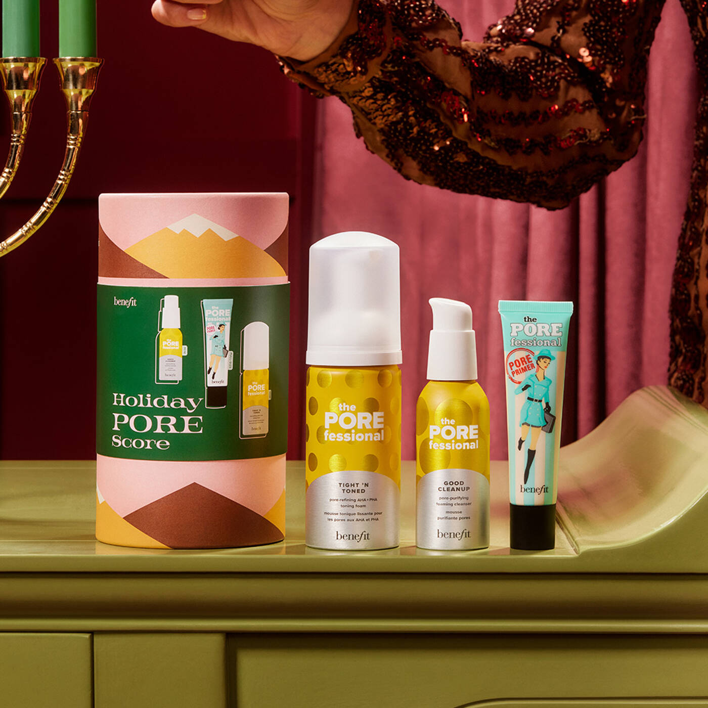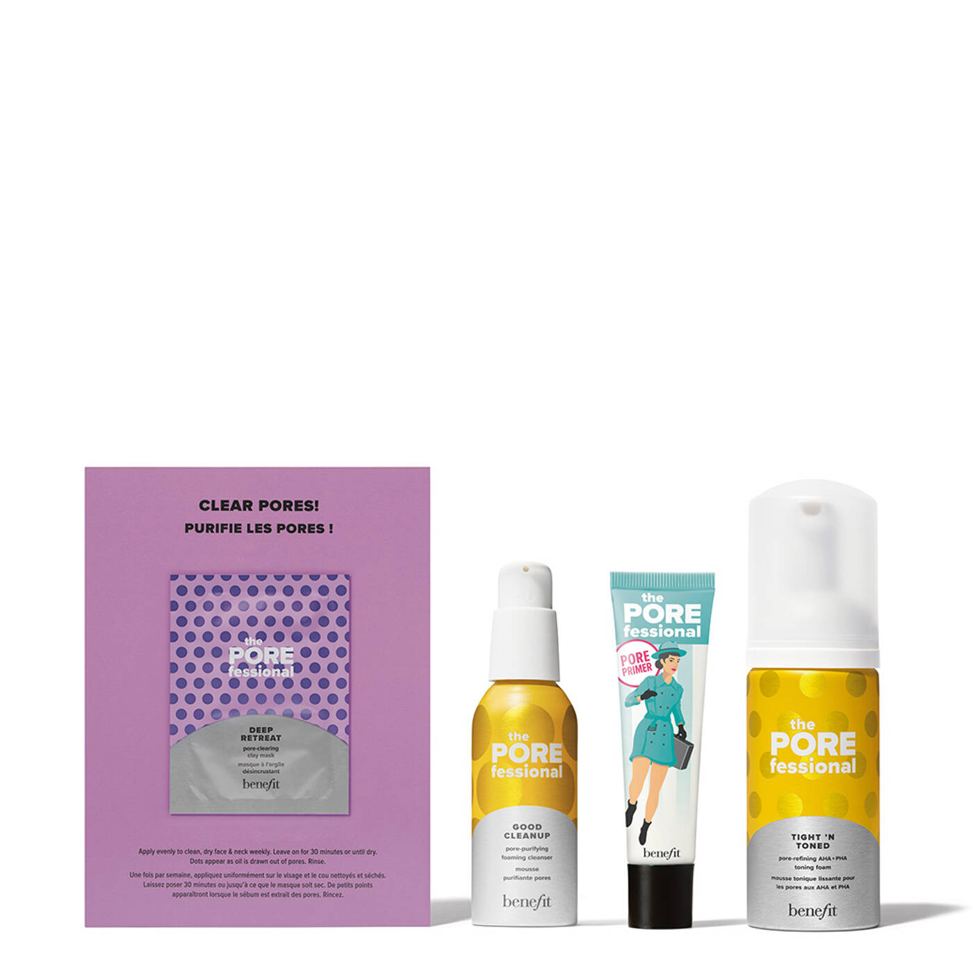 Holiday Pore Score Pflege Set – Full-Size Primer, Mini Reinigungsschaum & Schaum-Toner und Tonerde-Maske in Probiergröße