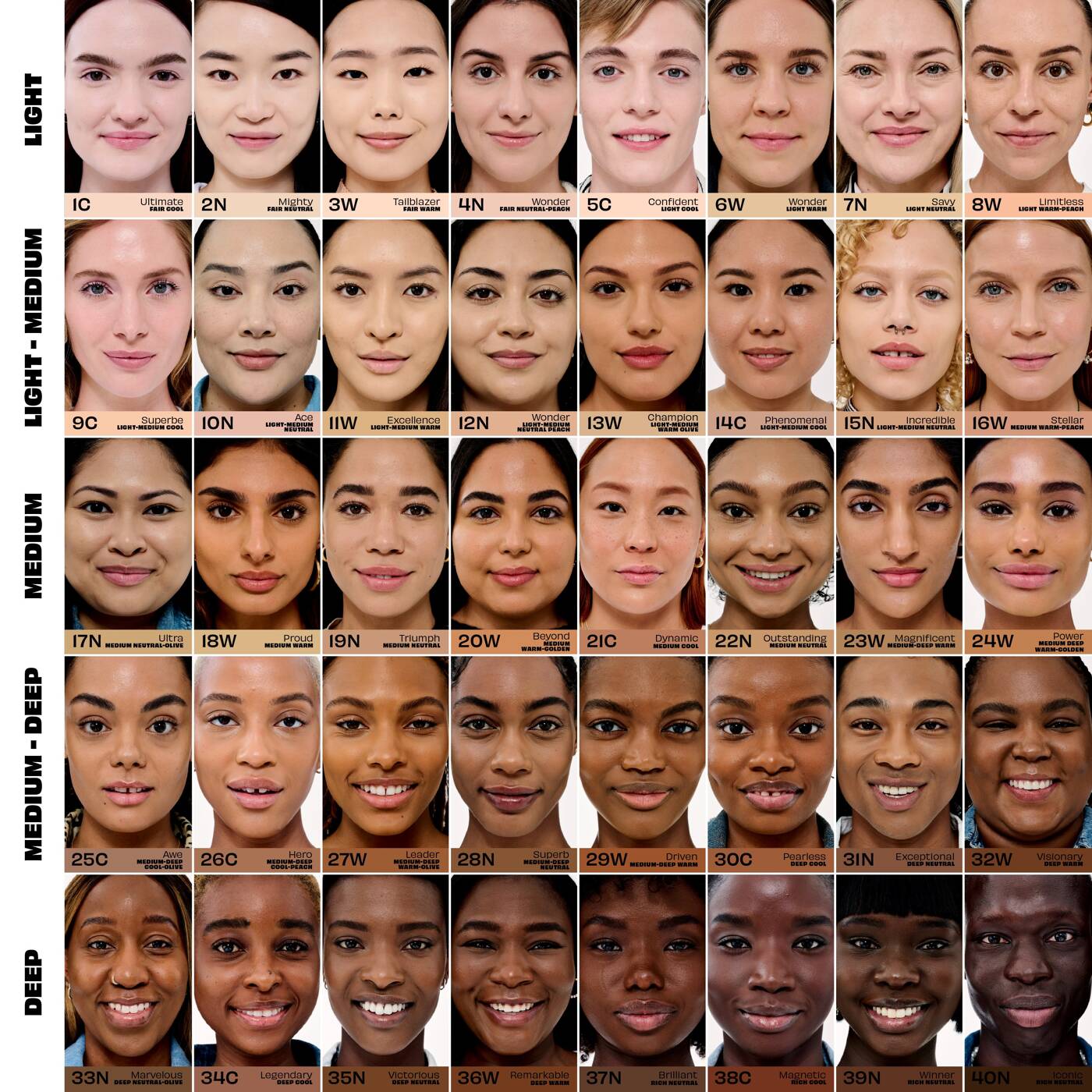 Wähle dann deinen Hautton von hell bis dunkel und gleiche ihn mit unseren 40 Farbtönen ab, die an über 600 Hauttönen getestet wurden.