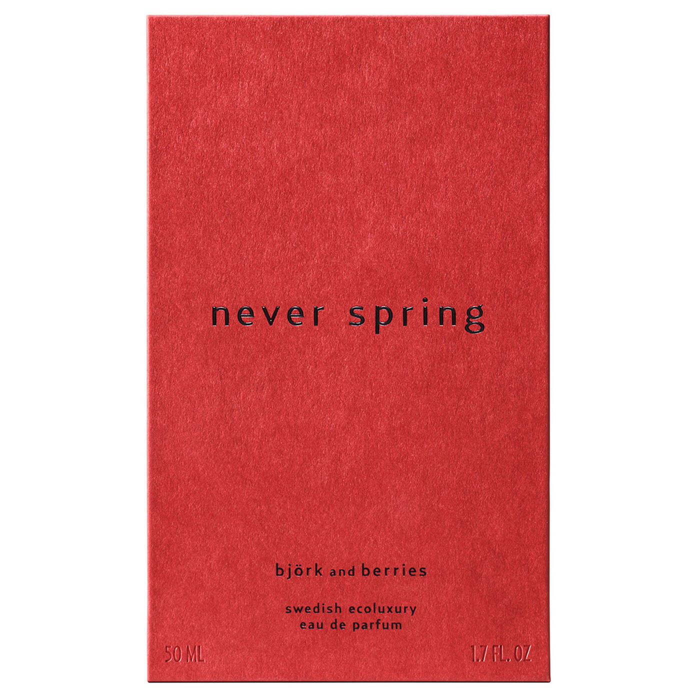 ‘Never Spring’ ist von der Sehnsucht nach dem Frühling inspiriert, der nie zu kommen scheint. Ein grüner und knackiger Duft mit Noten von Zitrone und Zedernholz. Plötzlich wird die Sonne warm genug, Bäume fangen an zu blühen, die Tage werden länger, und gegen Abend nimmt der Himmel einen tiefblauen, fast warmen Ton an.Duft: