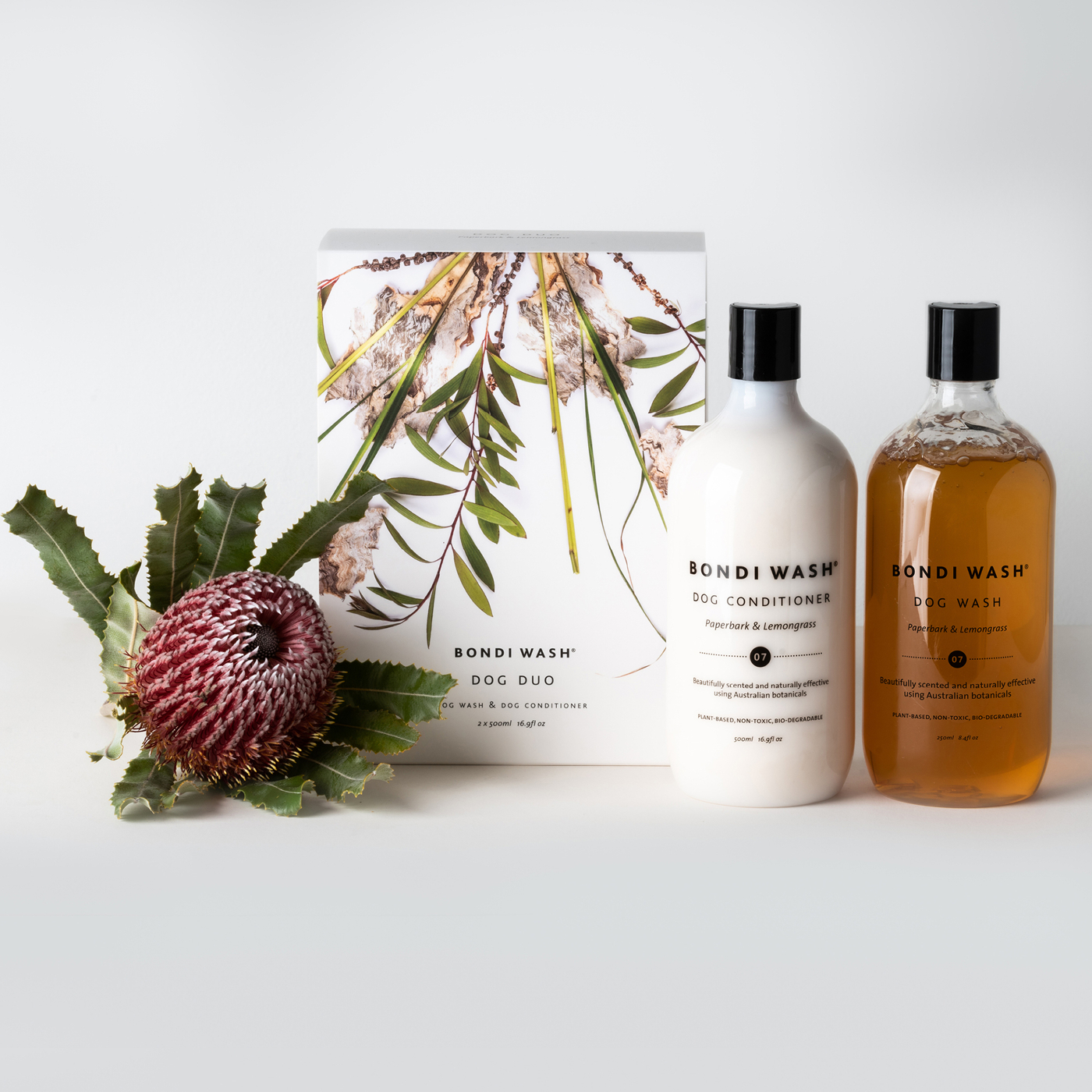 Ein Duo aus natürlichen Produkten, die speziell für Hunde mit empfindlicher Haut entwickelt wurden. Enthält ein Hundewaschmittel und eine Hunde Conditioner in Paperbark & Lemongrass. Verpackt in einer mit australischen Botanicals dekorierten Geschenkbox.