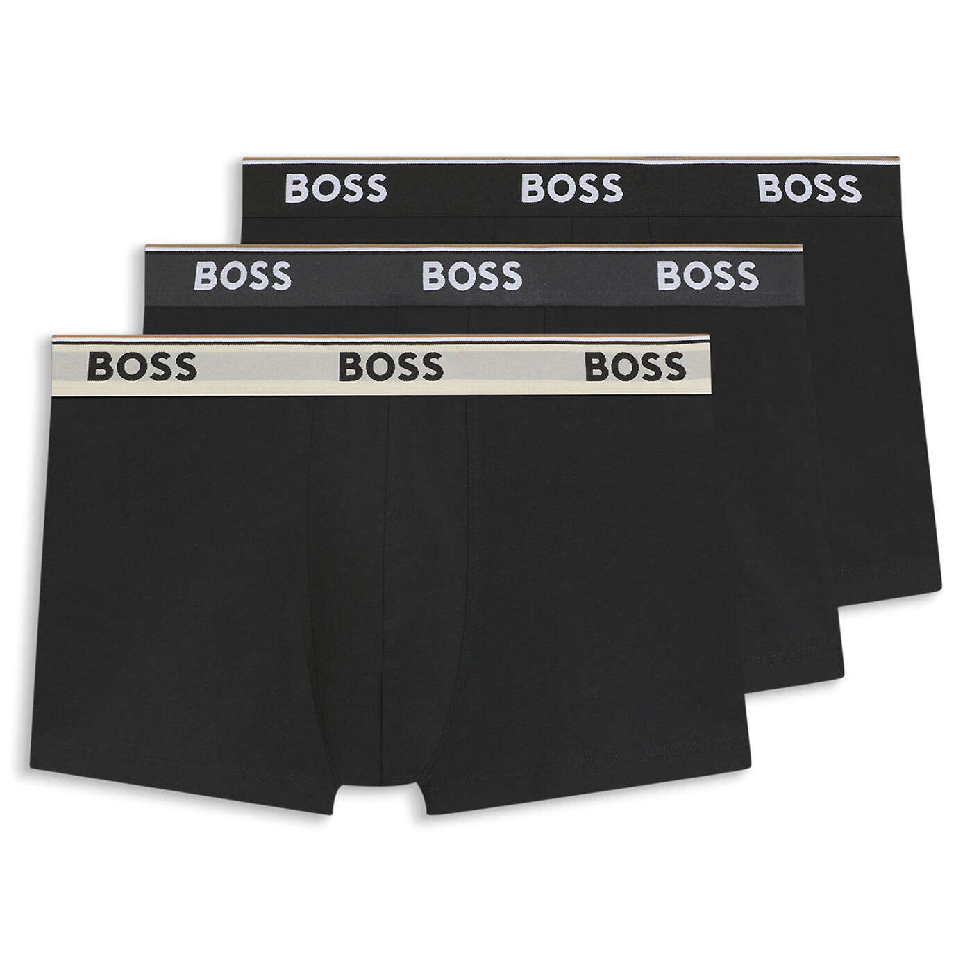 Eng anliegende BOSS Boxershorts mit kurzem Bein, die aus komfortablem Baumwoll-Jersey mit Elasthan-Anteil gefertigt sind. Die Unterwäsche mit mittlerer Bundhöhe ist mit Signature-Streifen und mehreren Logos versehen.