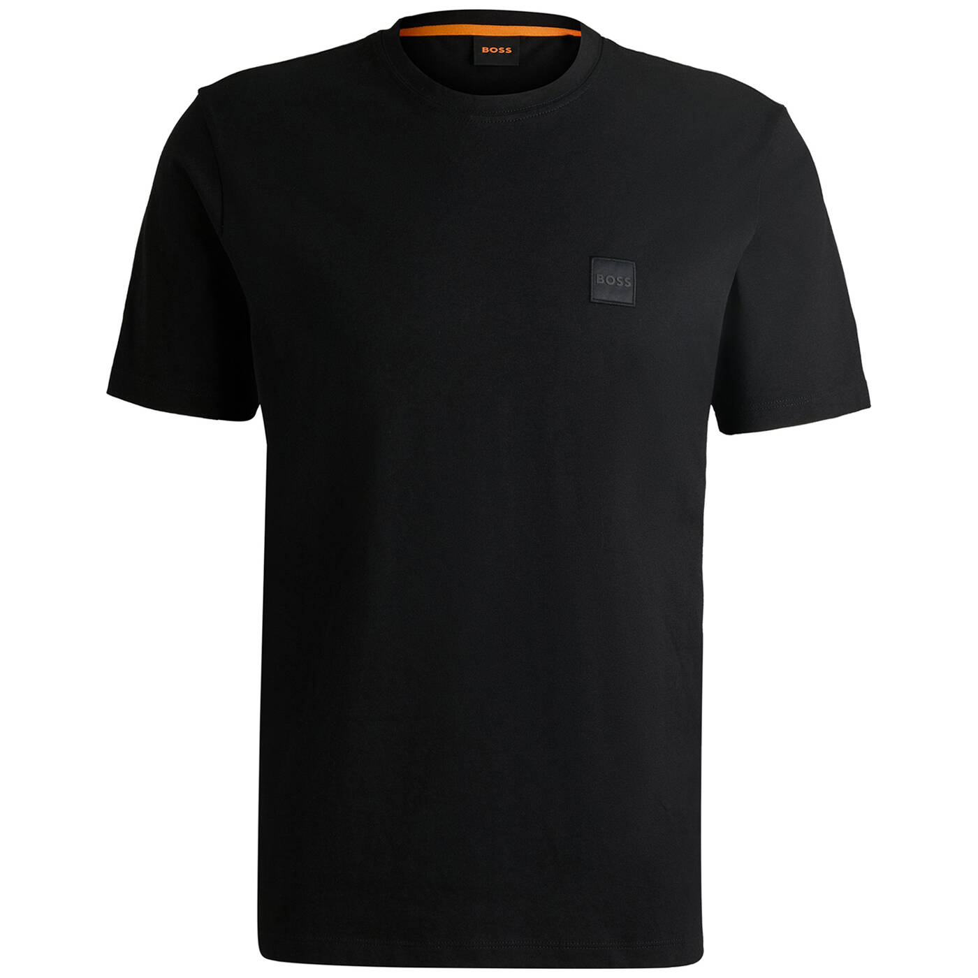 Gerade geschnittenes boss t-shirt mit gewebtem logo-aufnäher. aus mittelschwerem, softem baumwoll-jersey. dazu passt eine casual-hose.