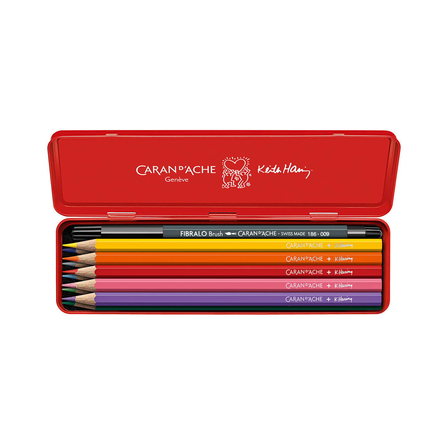 • Rote Sammler-Metallschachtel mit dem Partnerlogo signiert und in die Kollektion gekleidete Hülle – ikonisches Motiv von Keith Haring und Caran d‘Ache in rot