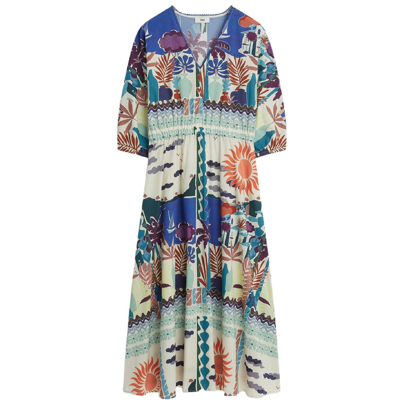 Das kleid verbindet sommerliche leichtigkeit mit einem ausdrucksstarken, exklusiven allover-print. der sanft fallende stoff sorgt für eine fließende silhouette, während die taillierte form durch den elastischen smok-einsatz eine schmeichelnde passform erzeugt - perfekt für warme sommertage, urlaubsfeeling oder besondere momente, die nach farbe und ausdruck verlangen.