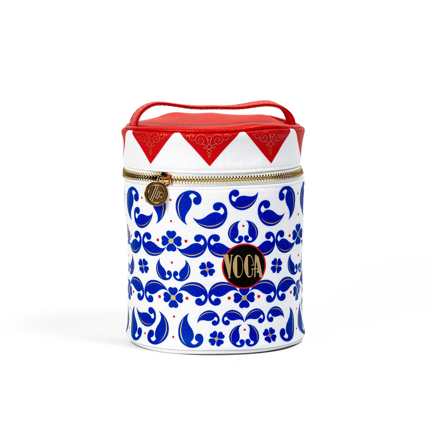 Das kühne Art-Déco-Design des Necessaires spiegelt eine Botschaft selbstbewusster Weiblichkeit wider und hüllt es in einen Strudel aus blauen Blütenblättern sowie roten und goldenen Details.