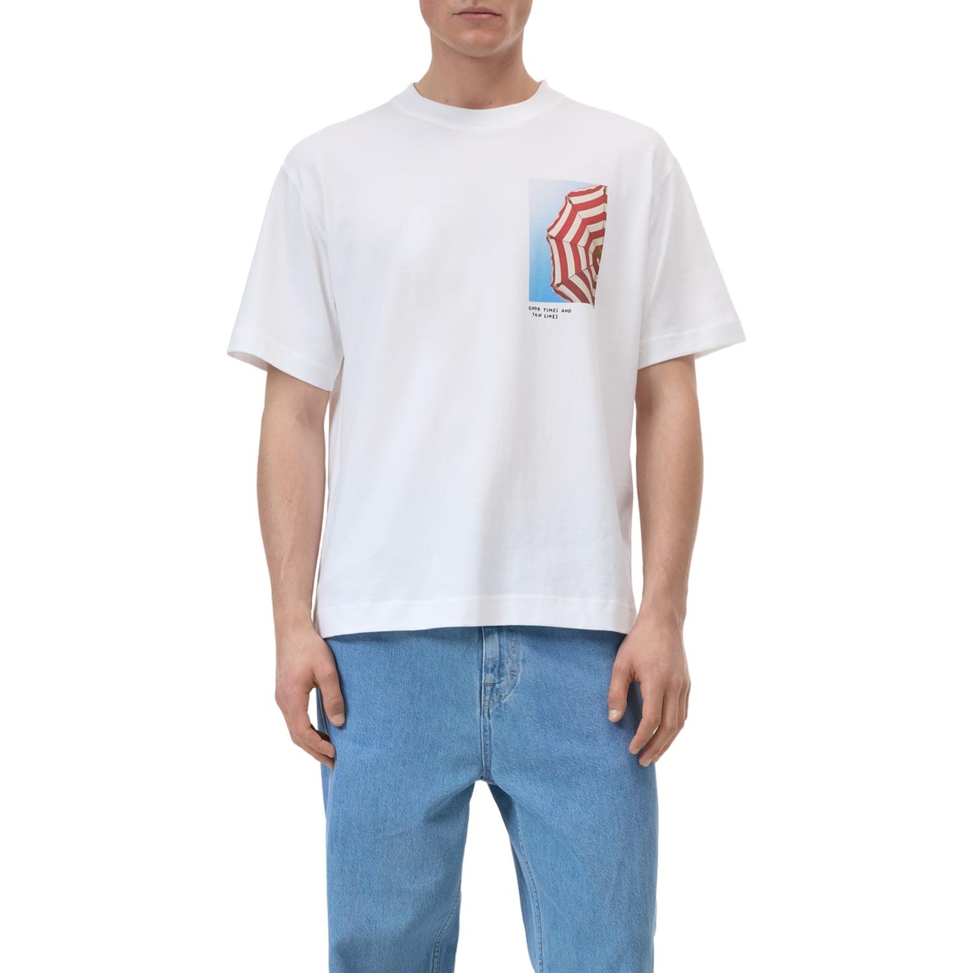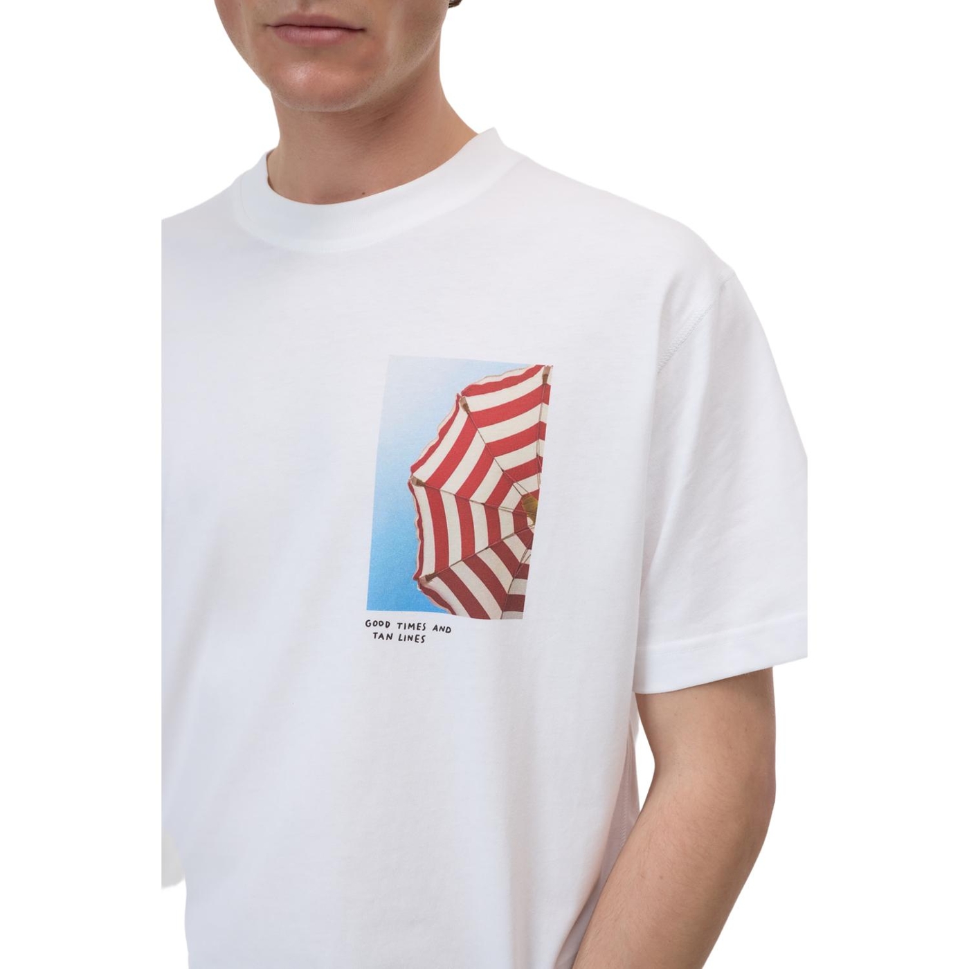 Der cleane, kompakte Single-Jersey aus 100% Bio-Baumwolle erhält durch die spezielle Stück- und Pigmentfärbung seinen besonderen Charakter. Das T-Shirt in regulärer Passform zeigt einen sommerlichen Fotoprint mit "Good Times and Tan Lines"-Schriftzug auf der Brust, während unser Logo auf dem Rücken platziert ist.