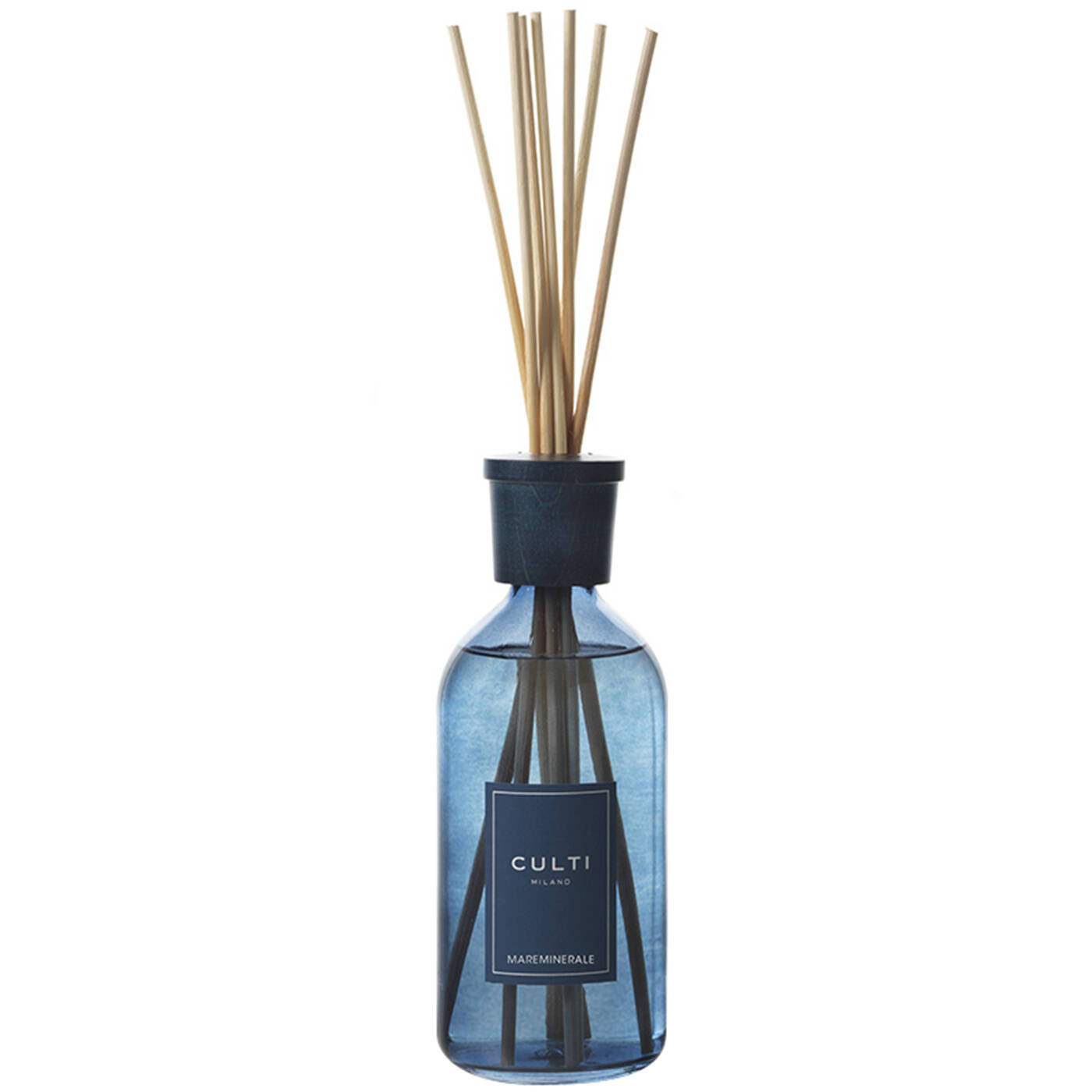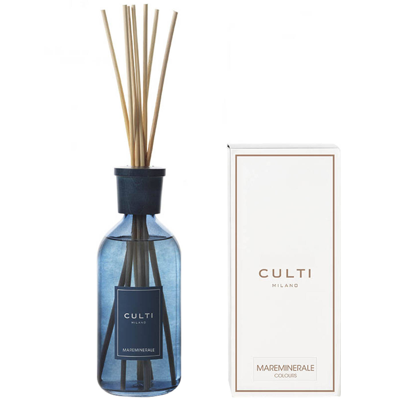 Flaschen aus klarem Farbglas mit farbigen Etiketten und Verschluss aus blauem Ahornholz. Die Linie CULTI COLOURS ist ein wahrer Energieschub, der jeden Raum belebt. Mareminerale: Die Sonne geht über dem Meer auf: Die Schritte landen sanft am Ufer und nehmen die scharfe Energie des Jods und den feuchten Geruch des Treibholzes auf, das vom Schaukeln der Wellen geglättet wird. Der Schwung eines Spaziergangs in der Morgendämmerung am Wasser entlang.