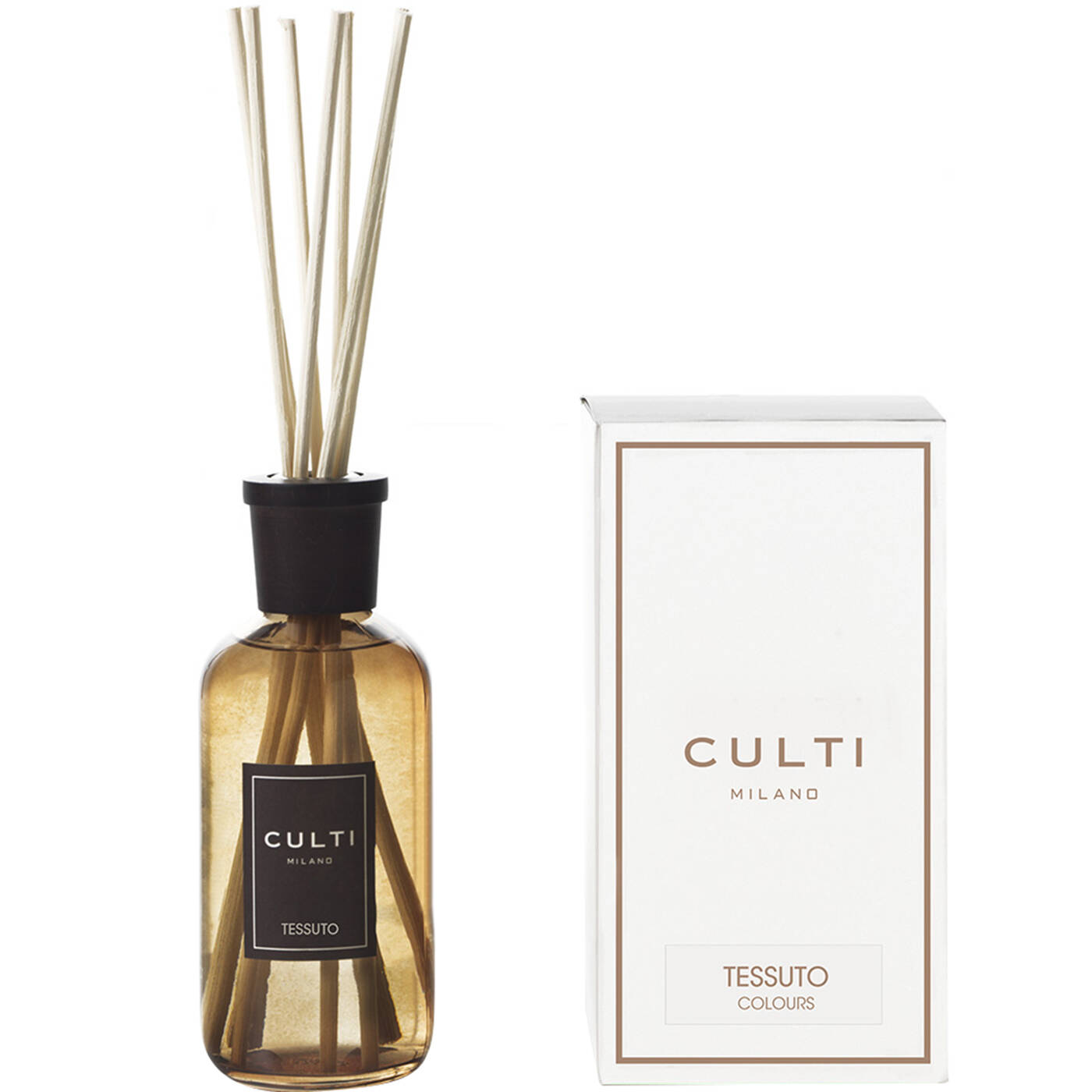 Klare, farbige Glasflaschen mit farbigen Etiketten und Deckel aus braunem Ahornholz. Die Linie CULTI COLOURS ist ein reizvoller Energieschub, der jeden Raum belebt. Tessuto: Mit offenen Händen durch ein Baumwollfeld gehen und die flauschigen Knospen streicheln. Die Leichtigkeit feiner Seidengewebe und natürlicher Leinenstoffe am Comer See berühren, die Augen schließen und ihre kühle, beruhigende Textur einatmen. Sich zu Hause fühlen, immer.