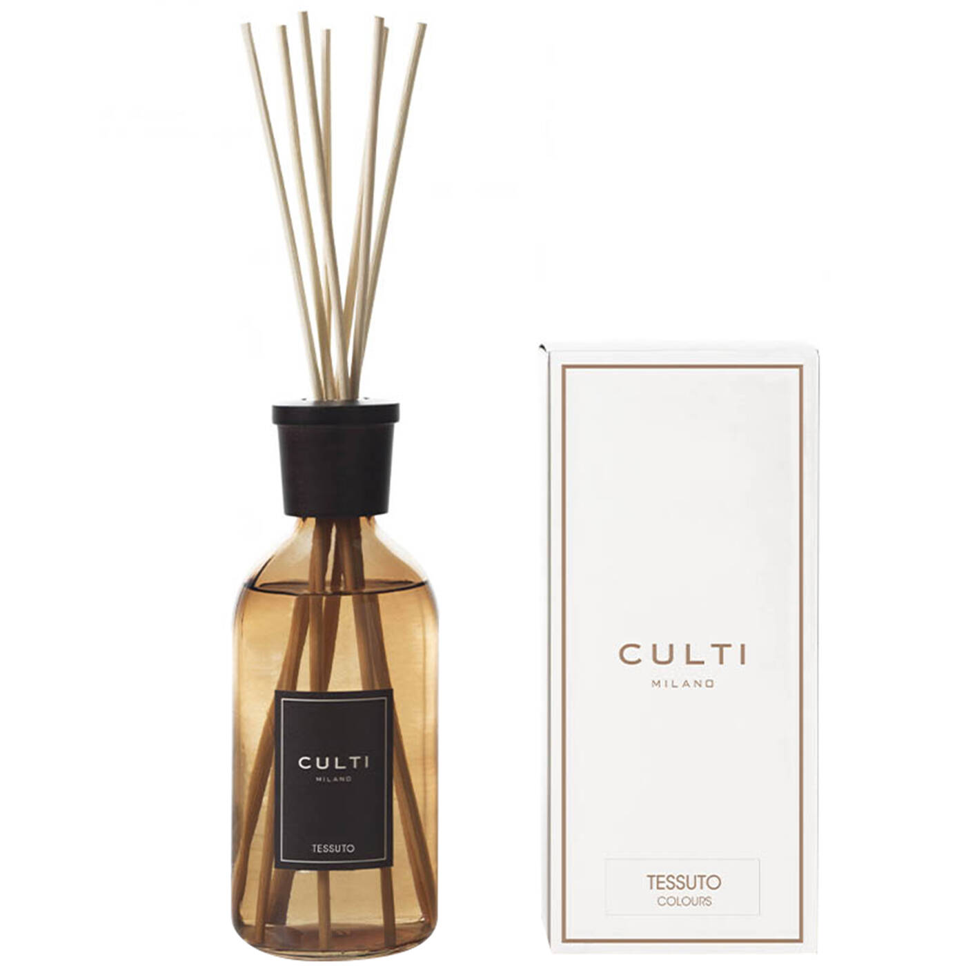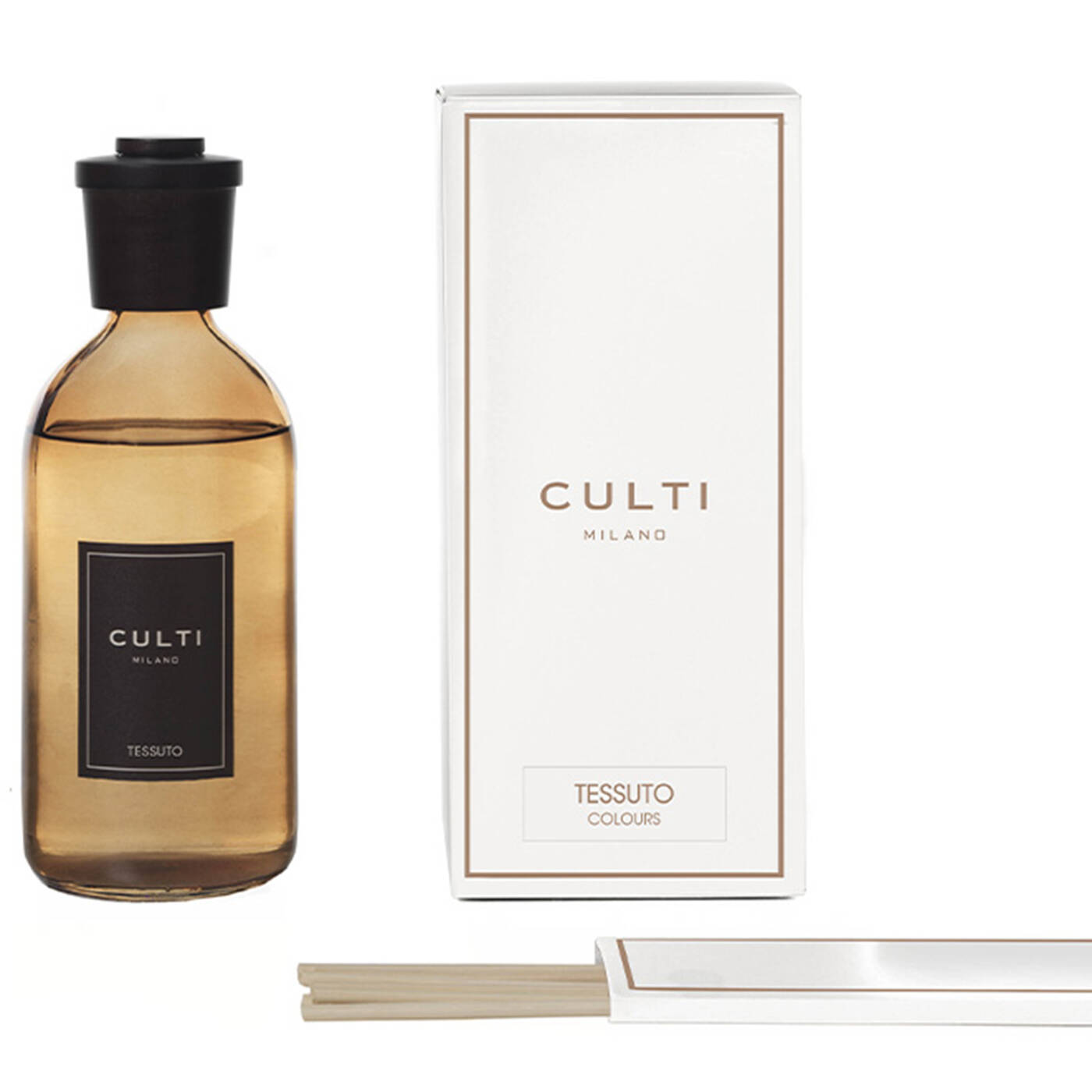 Klare, farbige Glasflaschen mit farbigen Etiketten und Deckel aus braunem Ahornholz. Die Linie CULTI COLOURS ist ein reizvoller Energieschub, der jeden Raum belebt. Tessuto: Mit offenen Händen durch ein Baumwollfeld gehen und die flauschigen Knospen streicheln. Die Leichtigkeit feiner Seidengewebe und natürlicher Leinenstoffe am Comer See berühren, die Augen schließen und ihre kühle, beruhigende Textur einatmen. Sich zu Hause fühlen, immer.