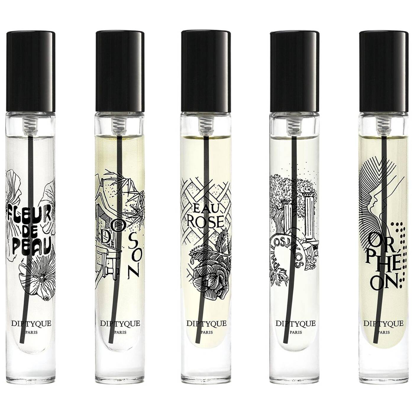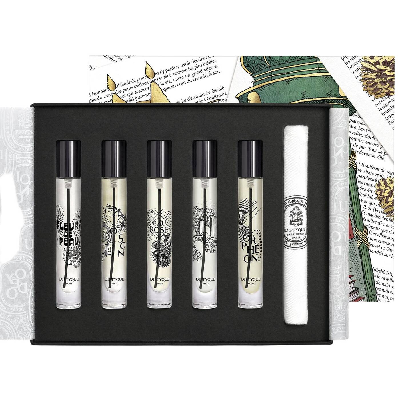 Entdecken Sie fünf ikonische Diptyque Eaux de Parfums in Miniaturgröße in einer limitierten Geschenkbox: Fleur de Peau, Eau Rose, Do Son, Orphéon und Philosykos.