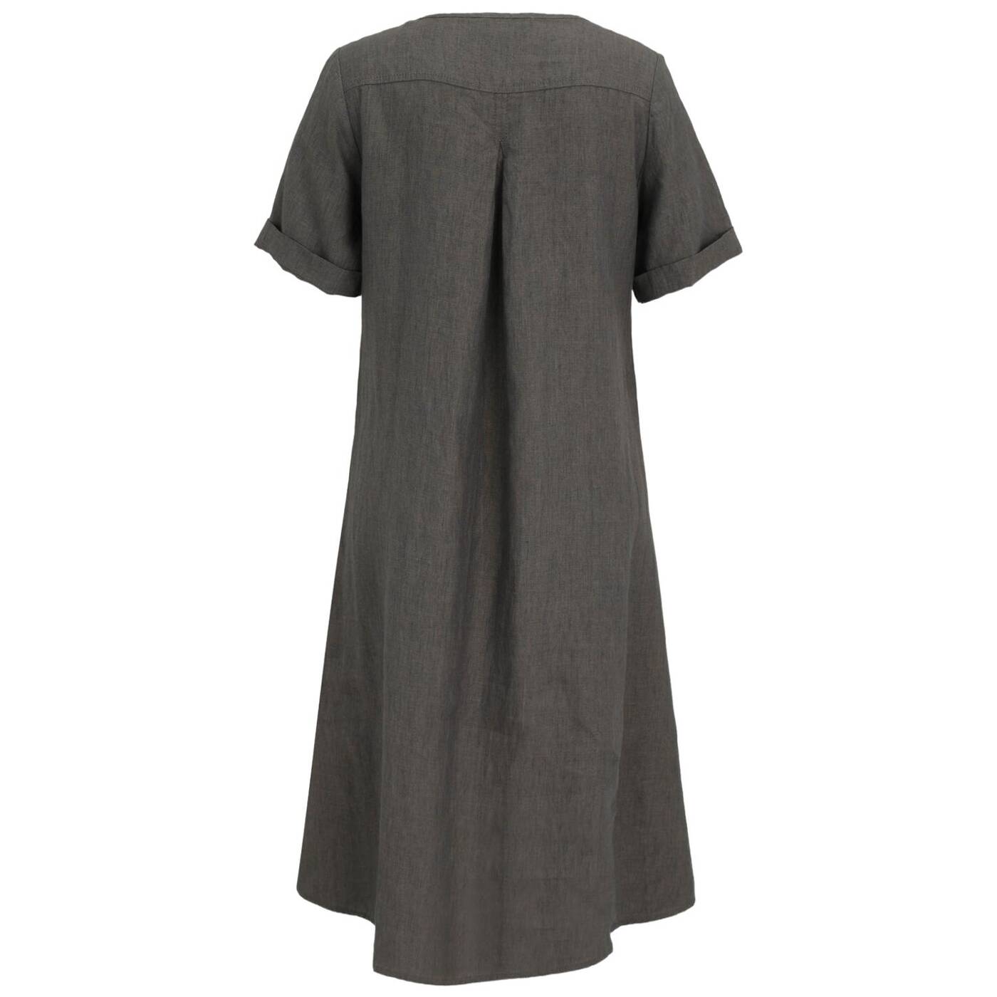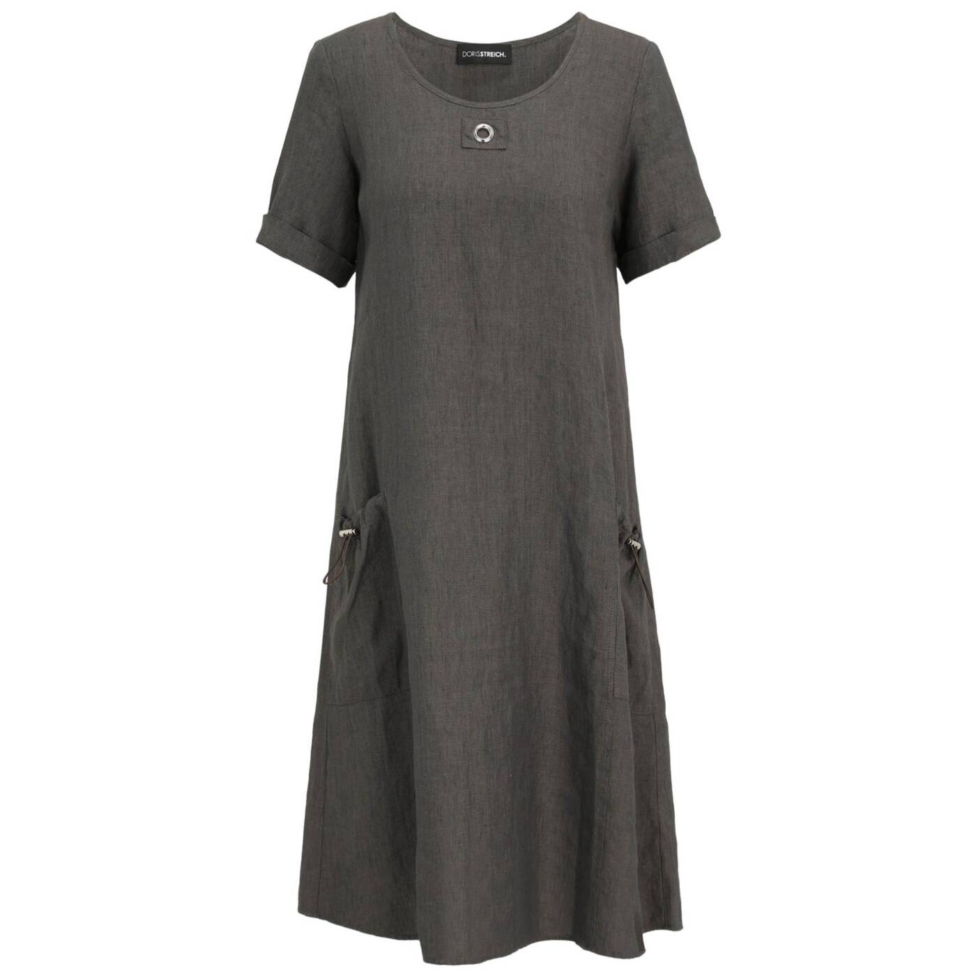 Das kleid von doris streich ist aus softem leinen-gewebe gefertigt. die zwei großen taschen mit tunnelzug, die silberfarbene unterlegte öse am halsausschnitt und die hochgeschlagenen kurzen ärmel runden das modell ab. die ausgestellte a-linie bietet
