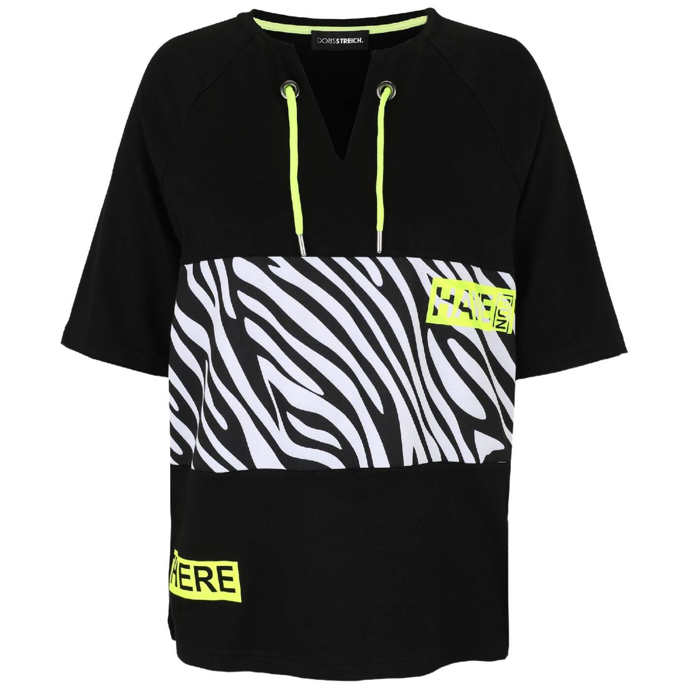 Das sweatshirt von doris streich ist aus softer elastischer sweatware gefertigt. ein frontprint mit weißem zebra-muster mit wording have fun machen dieses sweatie mit langem halbarm zu ihrem neuen lieblingsteil. zwei ösen mit dekorativen kordeln und der