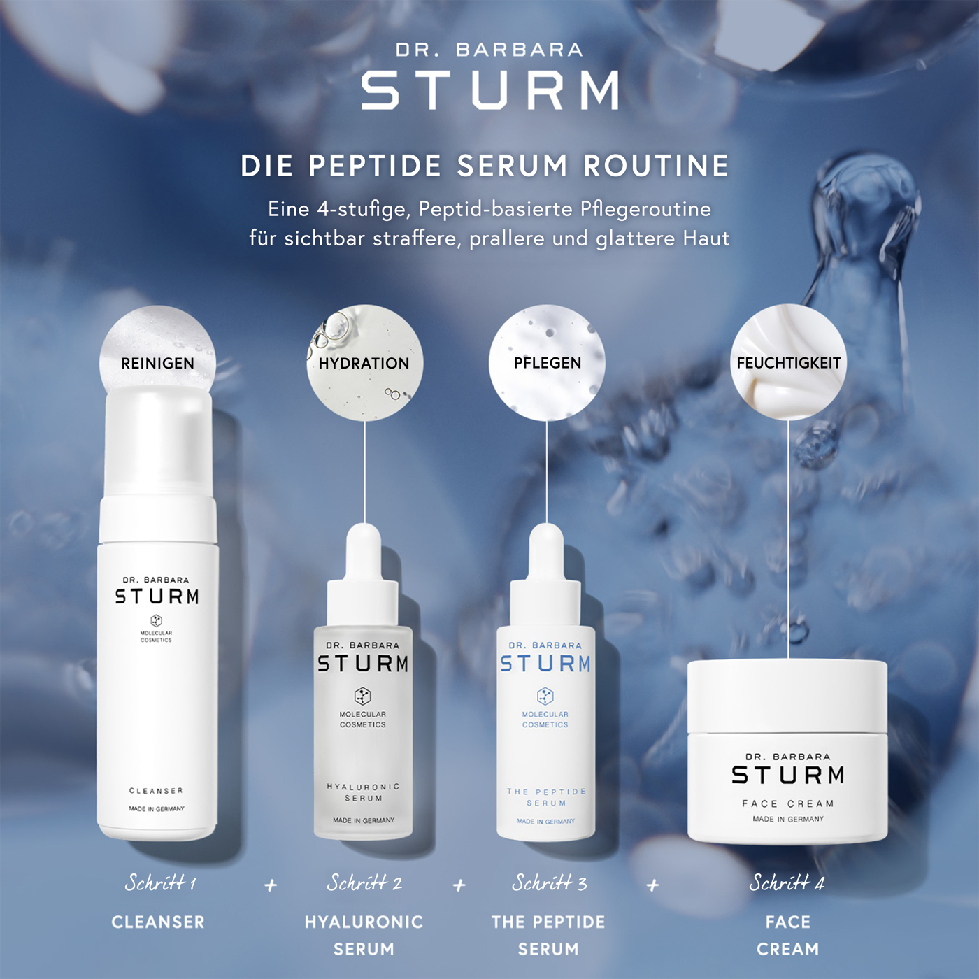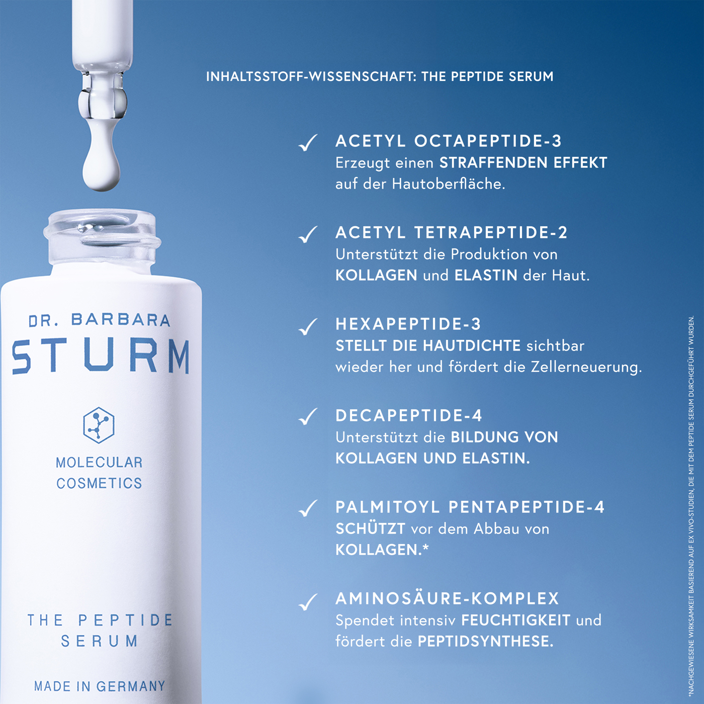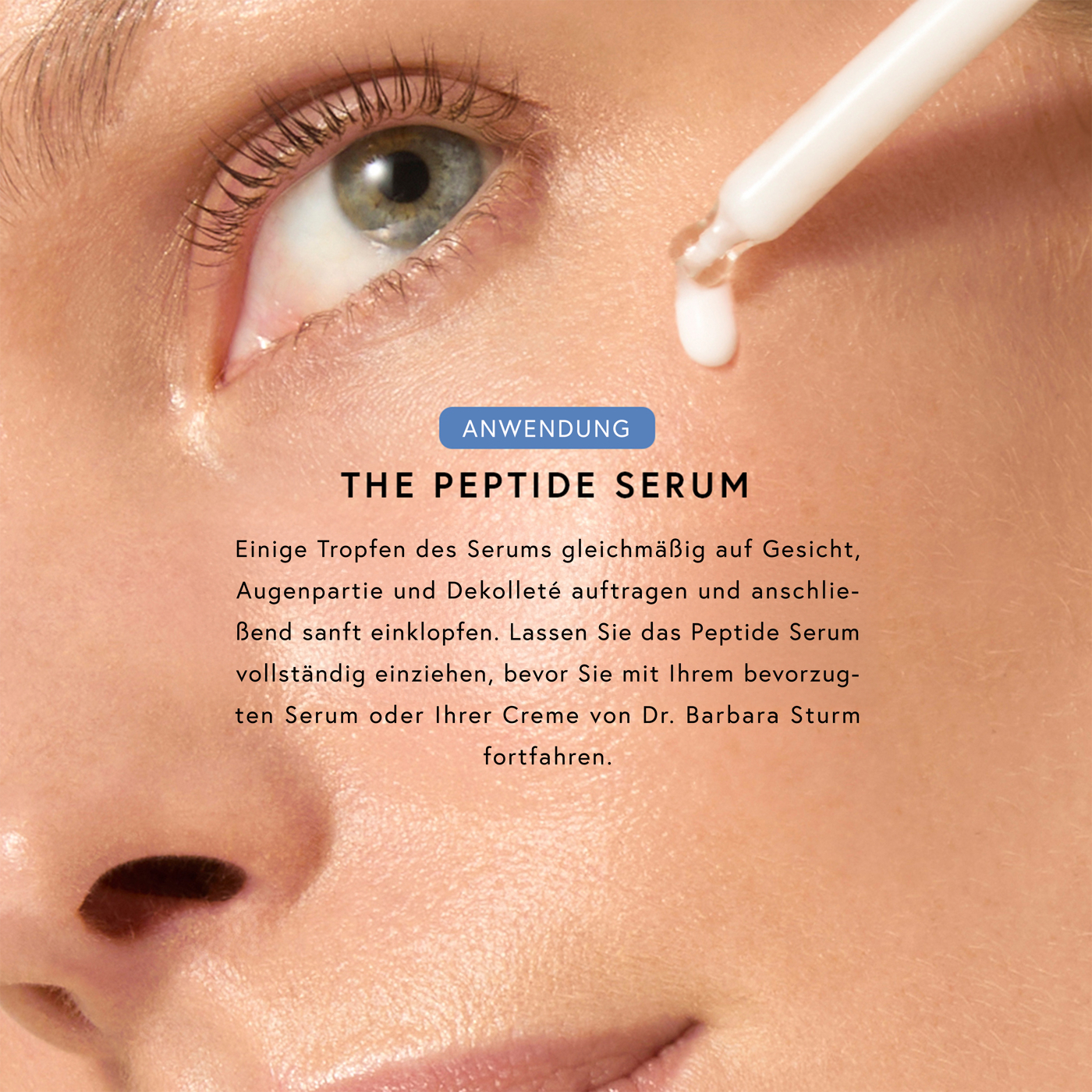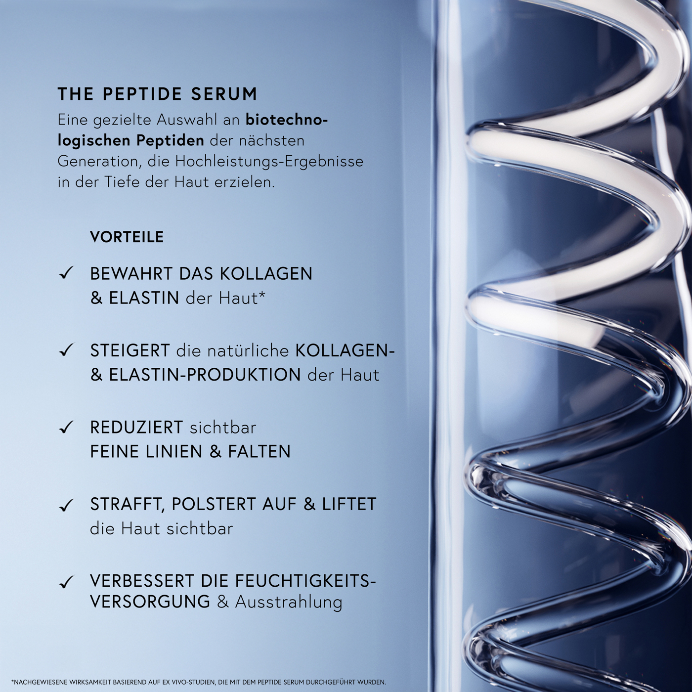Das Peptide Serum basiert auf einer Auswahl von hochmodernen Biotech-Peptiden, die tief in die Haut eindringen und dort gezielt wirken.