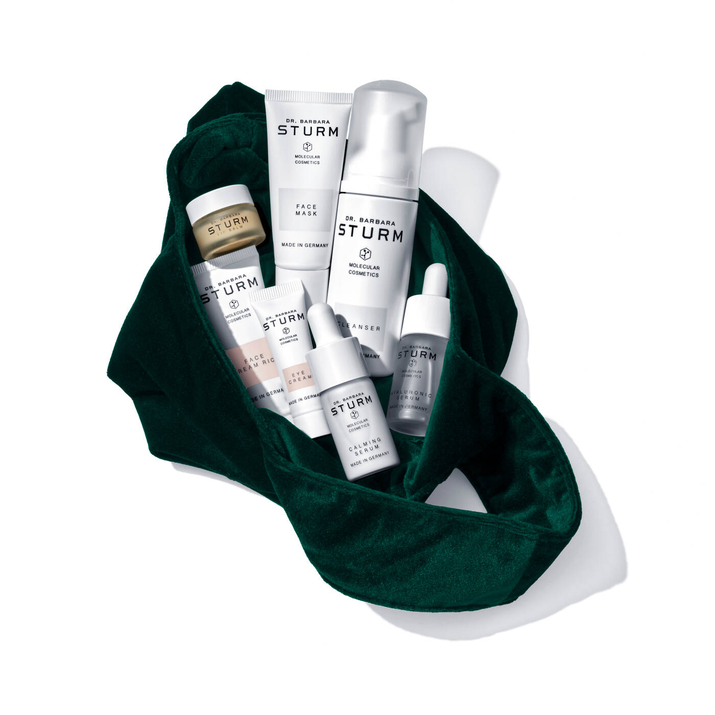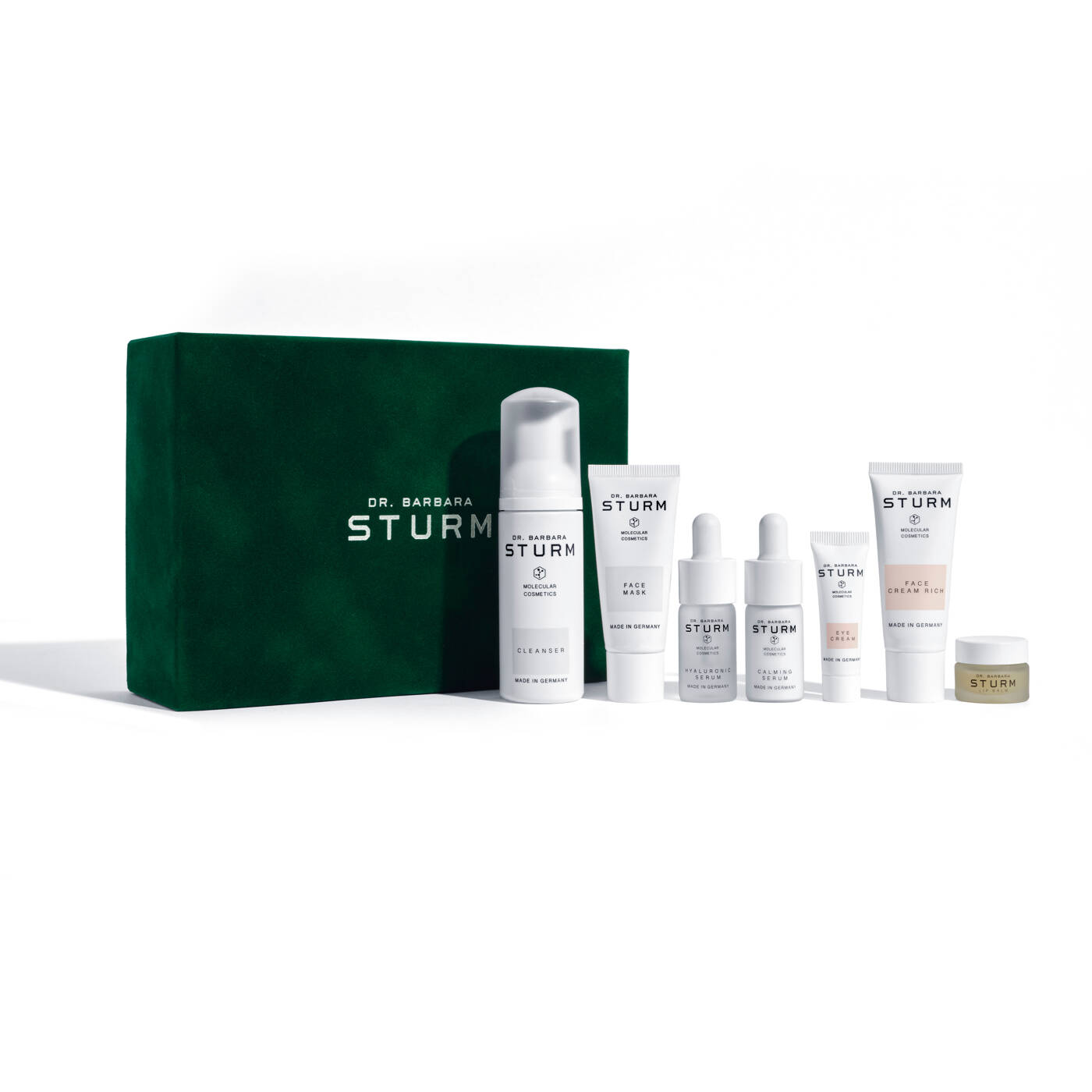 CLEANSER 50ml (Travel Size), FACE MASK 20ml (Travel Size), HYALURONIC SERUM 10ml (Deluxe Mini), CALMING SERUM 10ml (Deluxe Mini), FACE CREAM RICH 20ml (Travel Size), LIP BALM 3gr (Deluxe Mini), EYE CREAM 5ml (Travel Size)