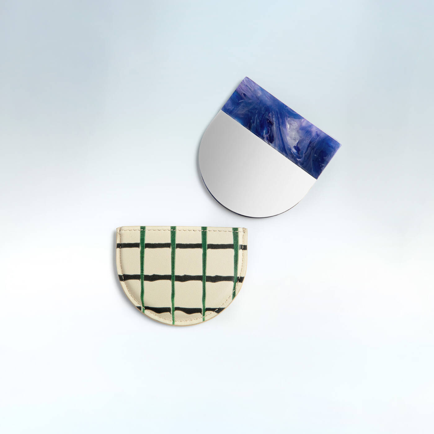Halbmondförmiger Spiegel aus italienischem Harz in einer kontrastierenden Kalbslederhülle nach Wahl