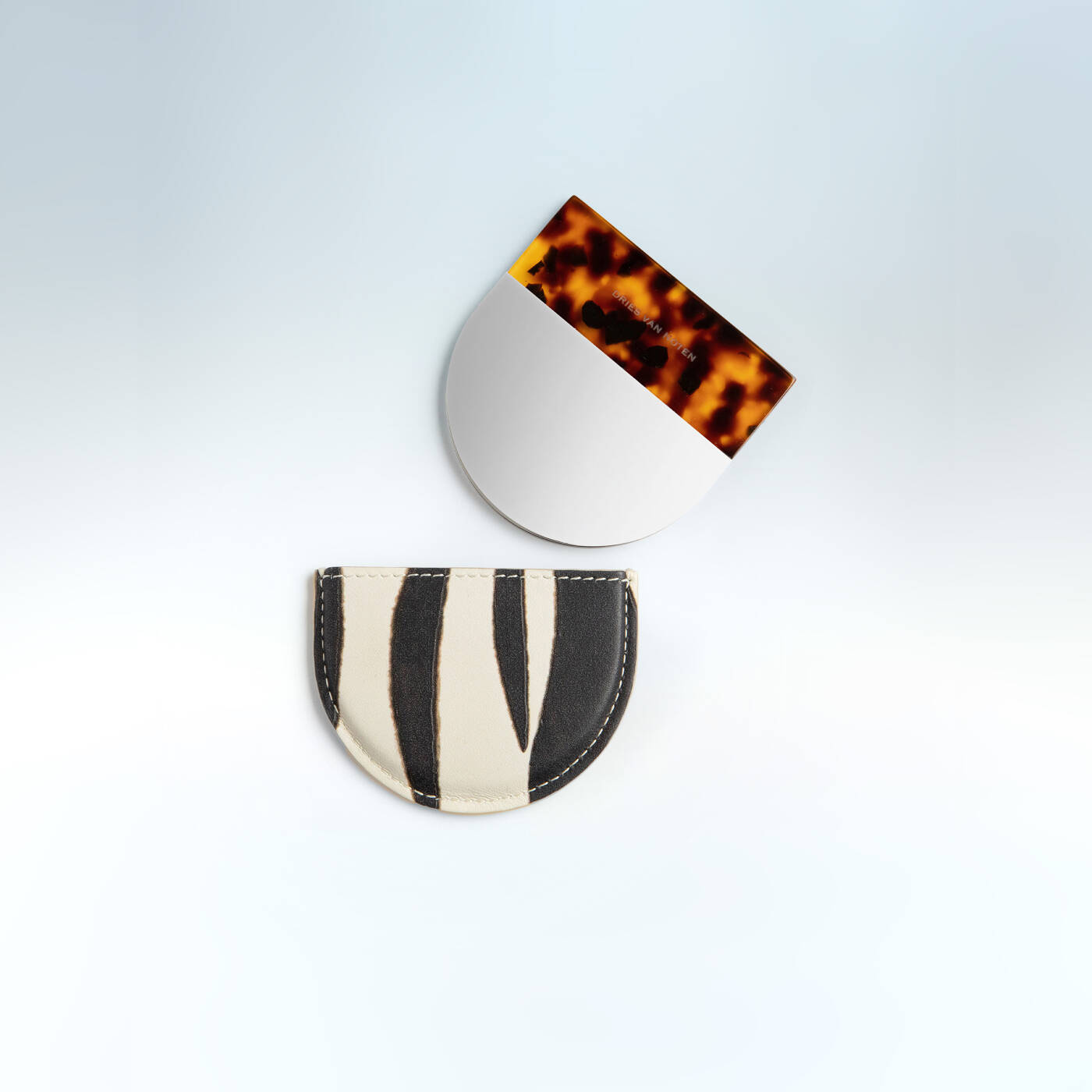 Halbmondförmiger Spiegel aus italienischem Harz in einer kontrastierenden Kalbslederhülle nach Wahl