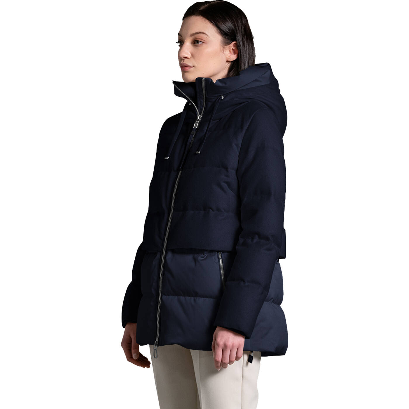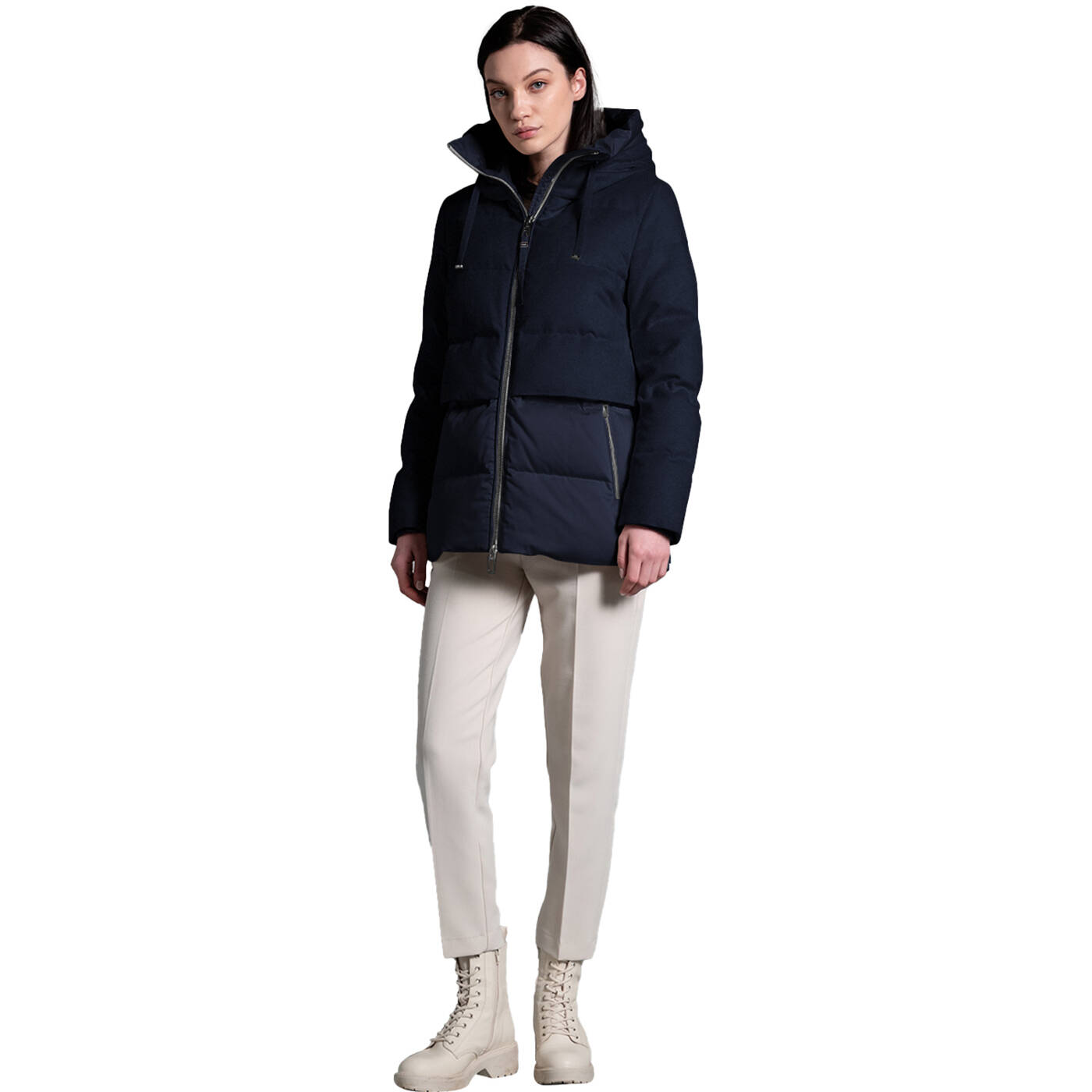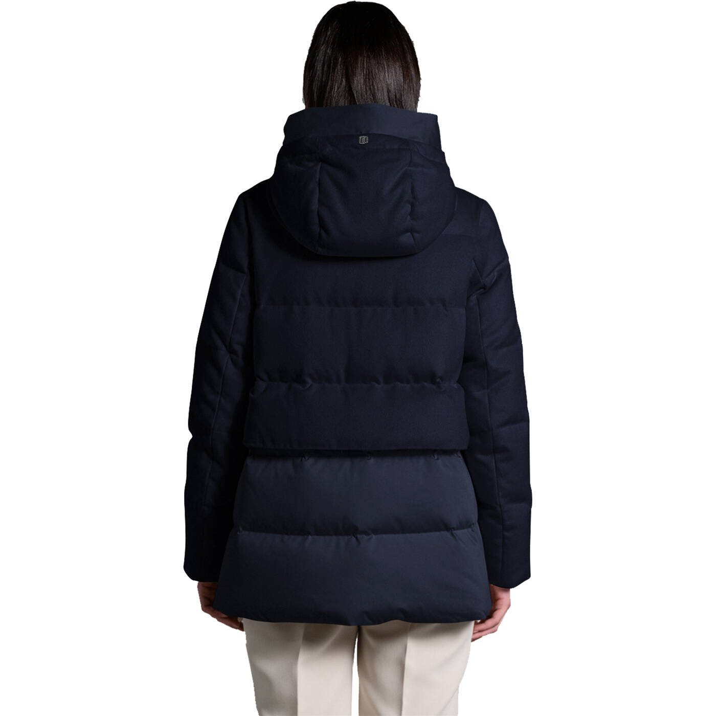 - mit Daunenfüllung aus zwei Materialien, hergestellt aus gesteppter technischer Wolle und Satin