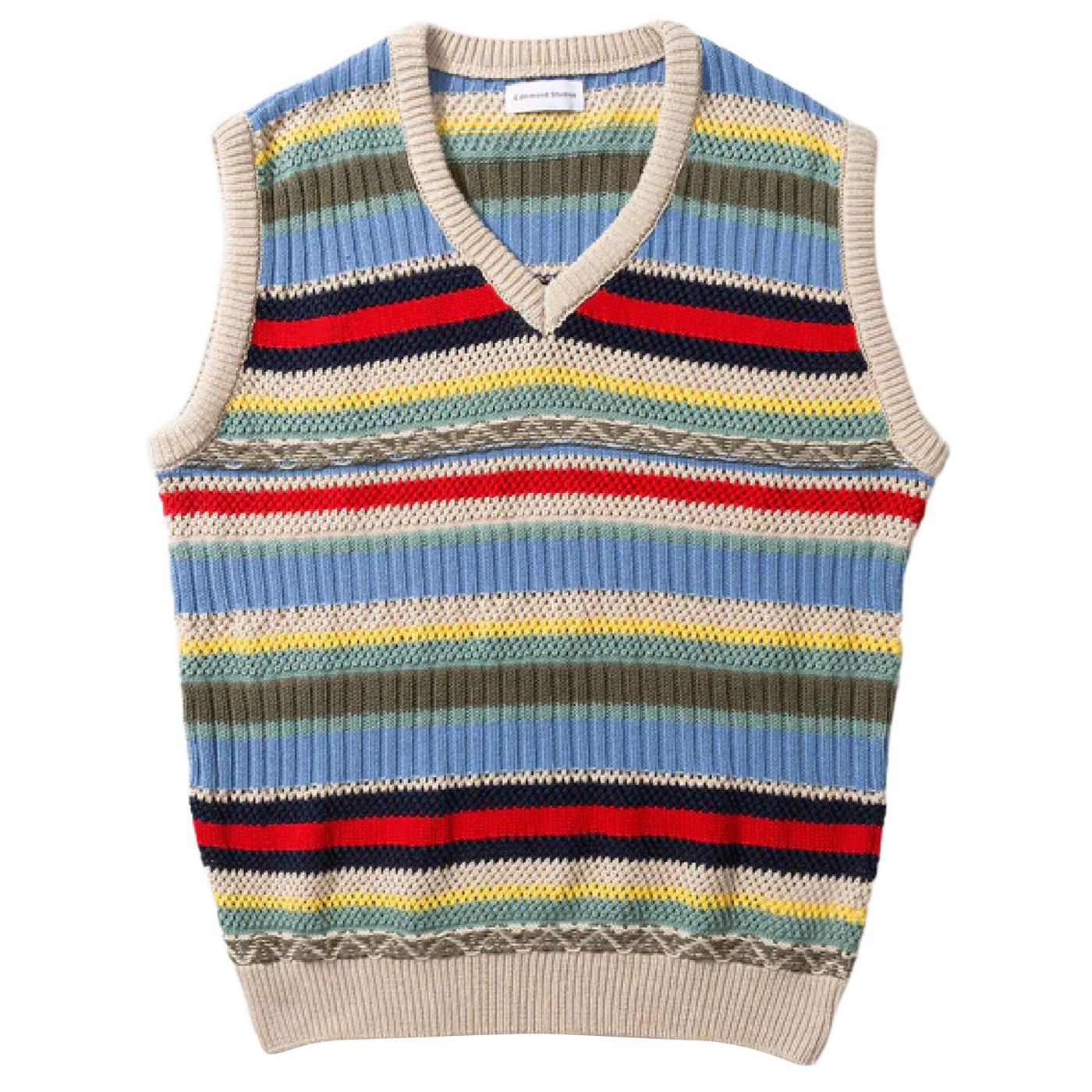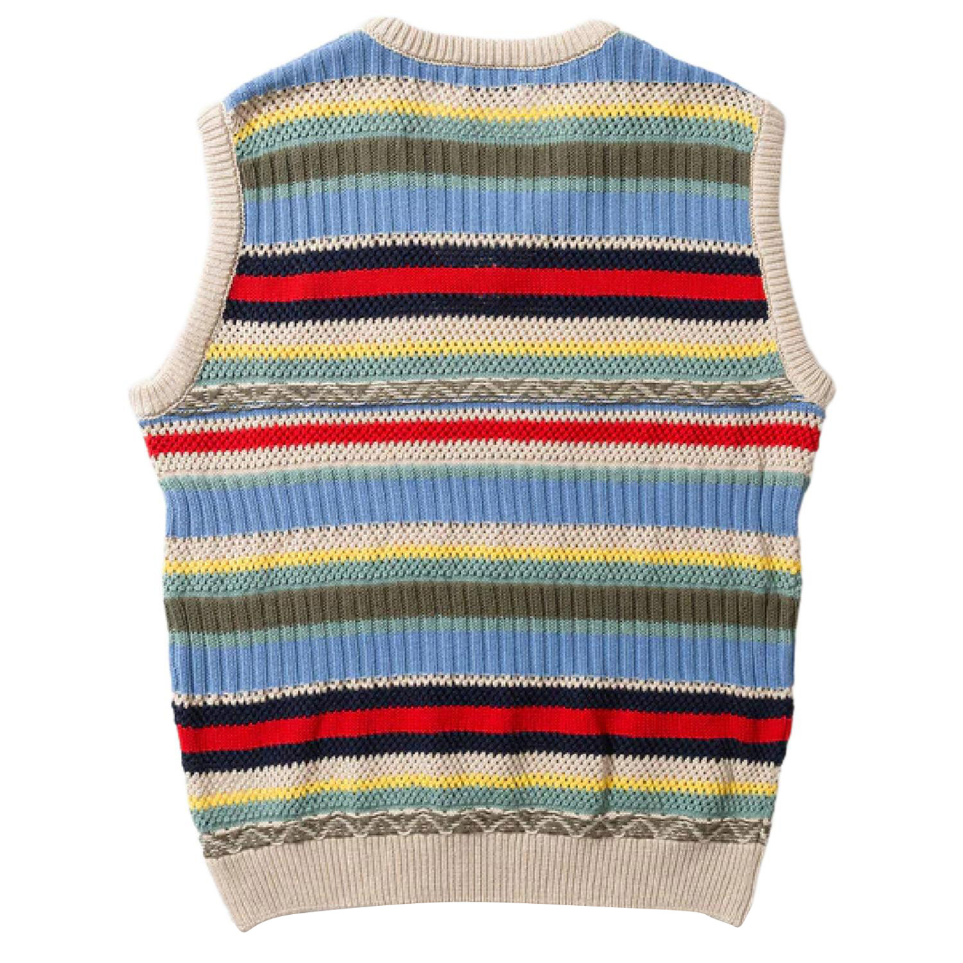 Cremefarbene Strickweste mit V-Ausschnitt und strukturierten Einsätzen in verschiedenen Farben.