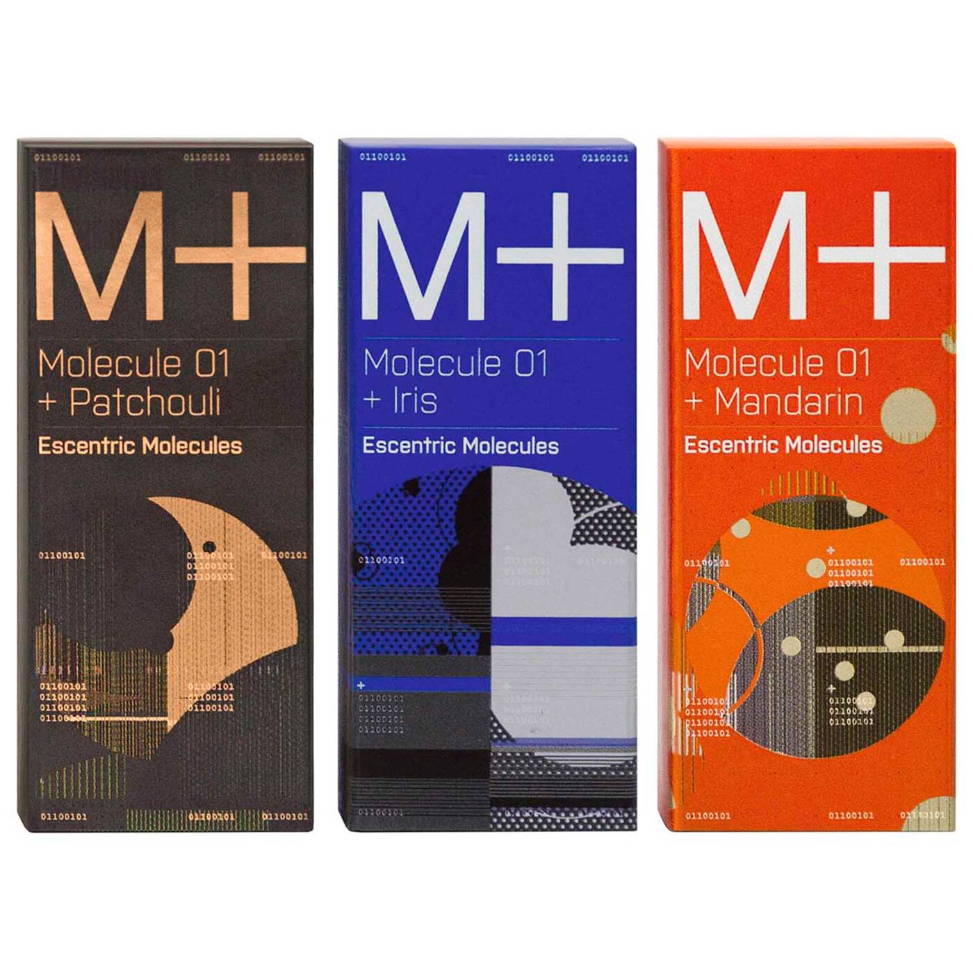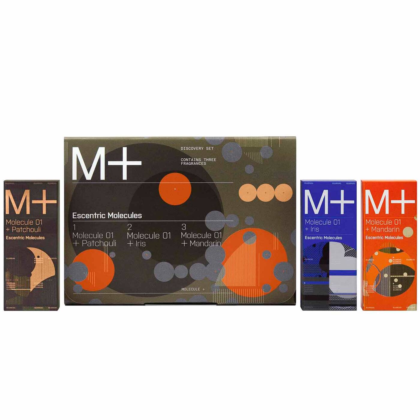 Das M+ Discovery Set enthält eine 2-ml-Probe jedes Molecule+-Duftes: Molecule 01 + Mandarin, Molecule 01 + Iris, Molecule 01 + Patchouli
