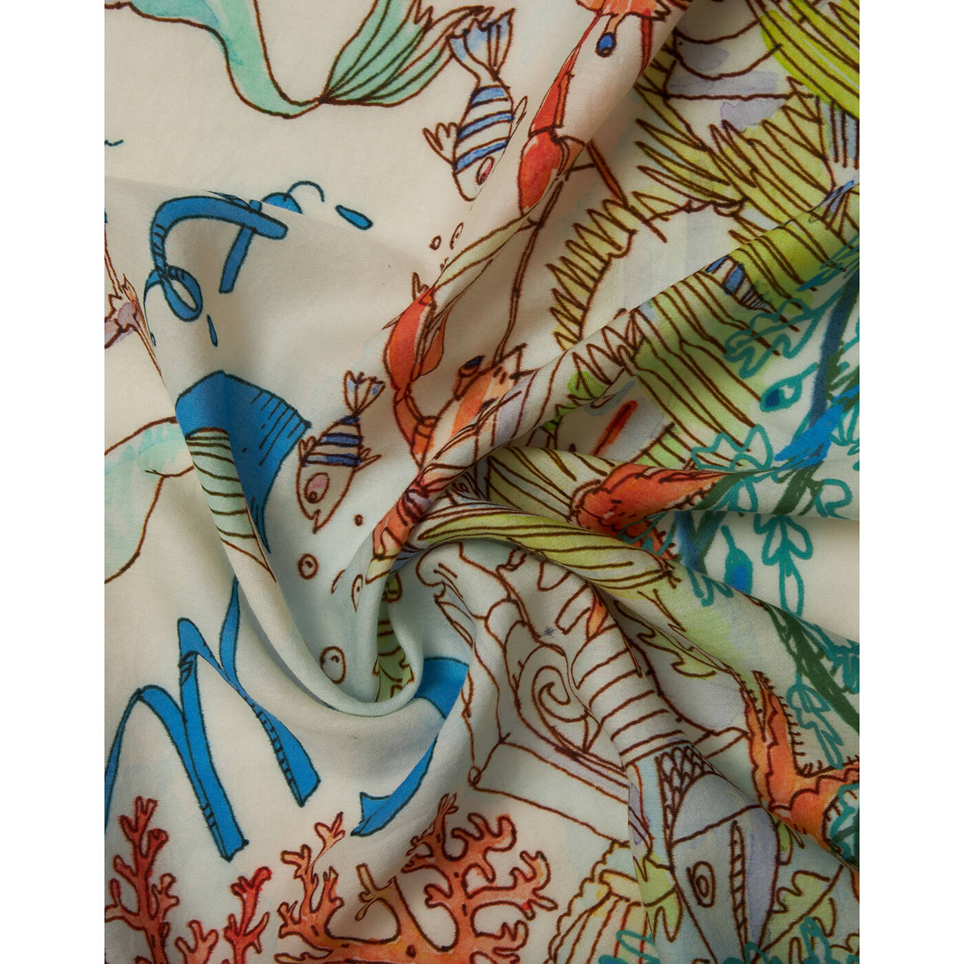 In Zusammenarbeit mit dem Florentiner Künstler und Architekten Paolo Fiumi entstand der quadratische Schal „Little Summer“, eine Hommage an die warme Jahreszeit. Leuchtende Farben und ausdrucksstarke Illustrationen bilden die Leinwand mit fantastischen Elementen. Illustrator Paolo Fiumi entwarf eine Meereswelt, die auf reiner Baumwolle gedruckt ist.