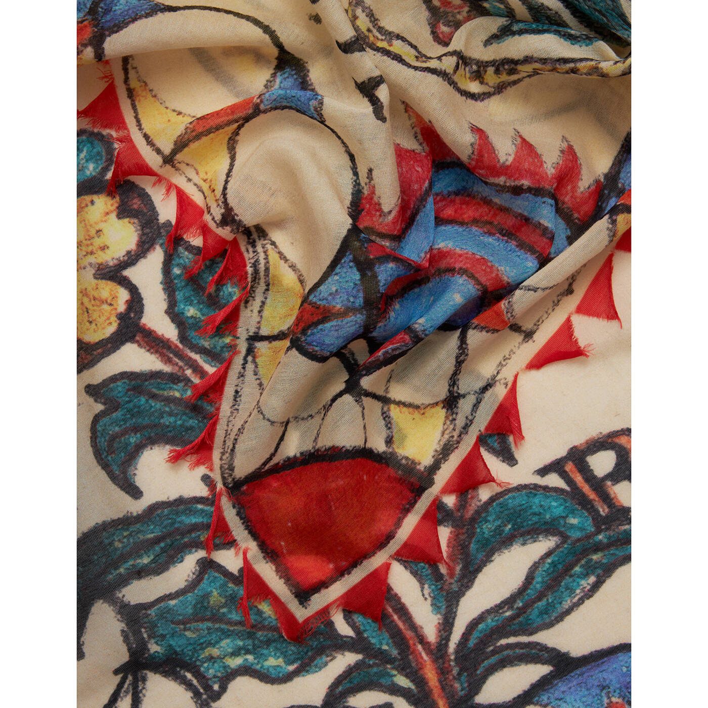 Der quadratische Schal Mara aus einem Baumwoll-Seiden-Gemisch besticht durch einen leuchtenden orangefarbenen Druck und einen farbenfrohen, dreieckigen Saum. Das luxuriöse und begehrte Accessoire ist perfekt für den Sommer.