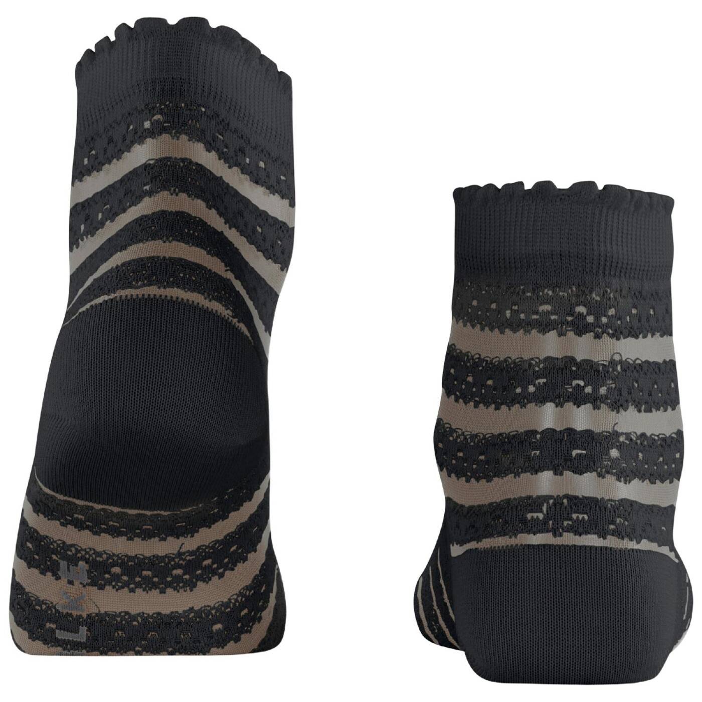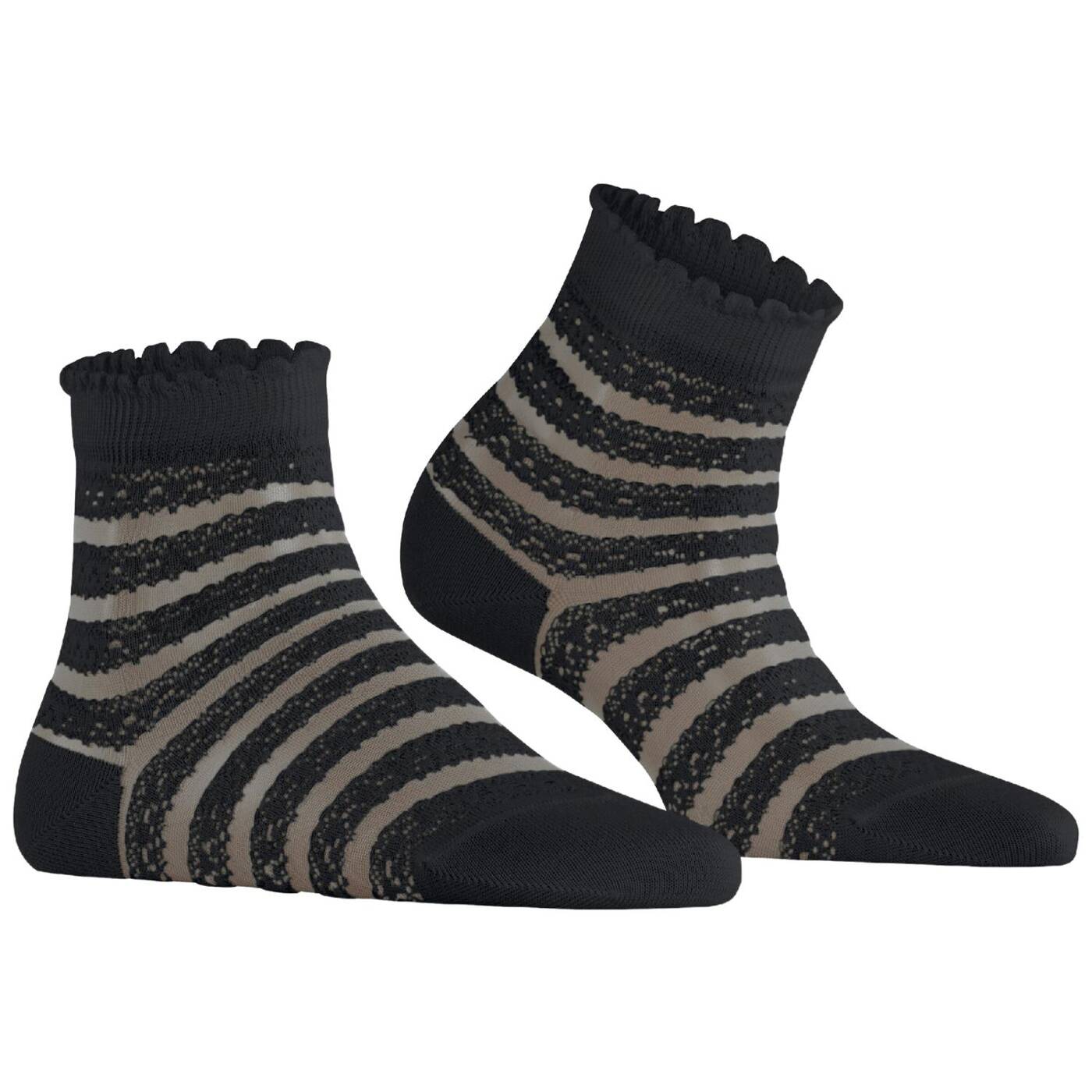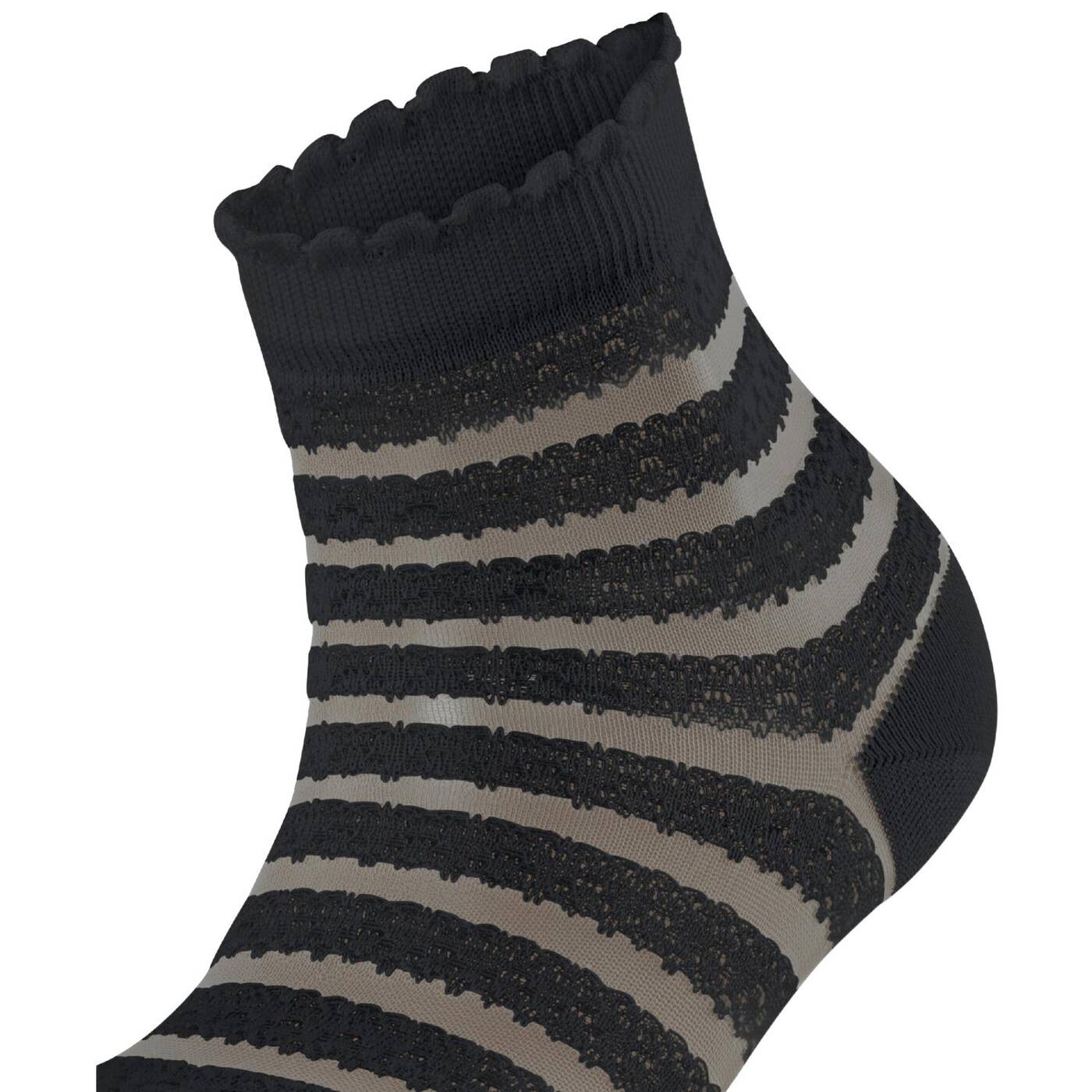 Dieser besonders feminine kurzstrumpf überzeugt mit einem raffinierten design, das traditionelle spitze und vintage-häkelmuster auf moderne weise vereint. das transparente allover-streifenmuster interpretiert klassische spitzenmotive neu und sorgt für einen romantischen look. das highlight des styles ist sein feminines abschlussbündchen mit einer modernen rüschen-optik. die kombination aus hautfreundlicher, nachhaltiger baumwolle gepaart mit funktionsgarnen sowie der perfekten falke-passform garantiert höchsten tragekomfort. sowohl zu sneakern, als auch in sandalen avanciert dieser artikel zum absoluten hingucker.