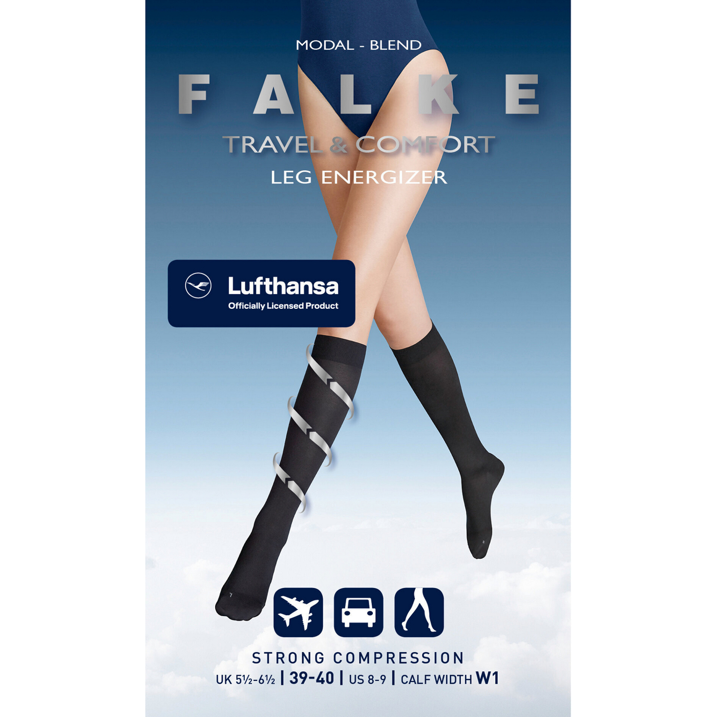 Dieser Kniestrumpf des FALKE Travel & Comfort Sortiments sorgt für eine aktive Belebung und Energie für die Beine dank Kompressionseffekt. Tanken Sie kontinuierlich neue Kraft bei extremen Belastungen im Sitzen, Stehen und Gehen sowie auf längeren Flugreisen. Beugen Sie geschwollenen, schweren Beinen vor und fühlen Sie sich den ganzen Tag über fit und gestärkt. Exzellenter Tragekomfort und uneingeschränkte Bewegungsfreiheit, sowie eine anatomische Passform und ein faltenfreier Sitz am Bein zeichnen diesen Artikel aus. Der eingesetzte Modalanteil bietet einen stilvollen und eleganten Look. W1 = 30-35 cm, W2 = 35-40 cm. Offizielles Lufthansa Lizenzprodukt.