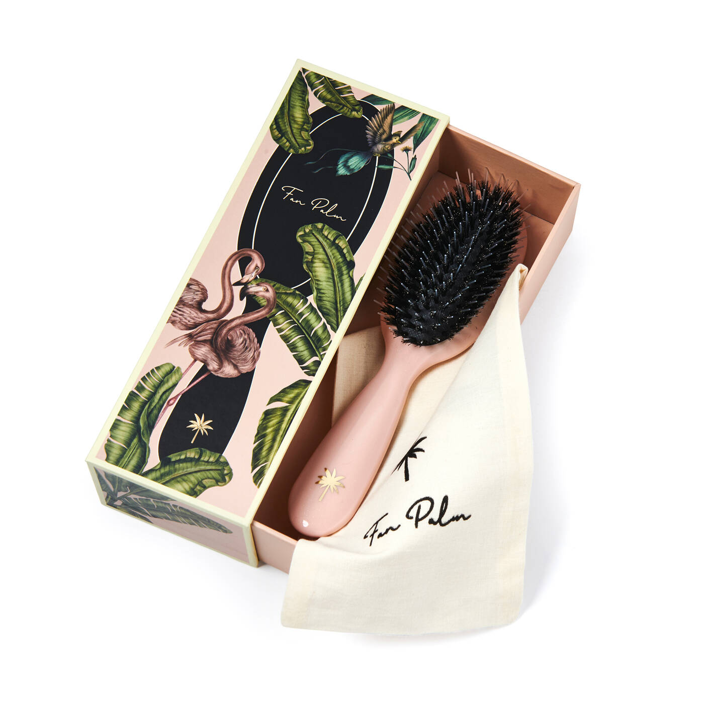 Die Wildschwein- und Nylonborstenbürste Blush von Fan Palm verleiht dem Haar Glanz und Geschmeidigkeit. Die Nylonborsten sind länger, um die Kopfhaut sanft zu stimulieren und das Haar zu entwirren, während die Wildschweinborsten dabei helfen, Talg zu verteilen. Sie regt die Durchblutung der Haarfollikel an und die meisten stellen fest, dass sie die Häufigkeit des Haarewaschens auf alle drei oder vier Tage reduzieren können. Wird in einer wunderschönen Schubladenbox mit Goldfoliendetails geliefert.