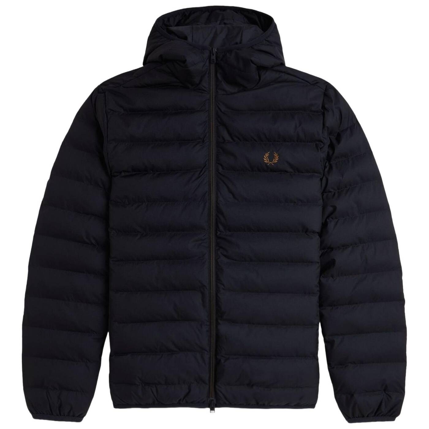 Eine isolierte Steppjacke aus vollständig recycelten Materialien mit Kapuze und Zwei-Wege-Reißverschluss.