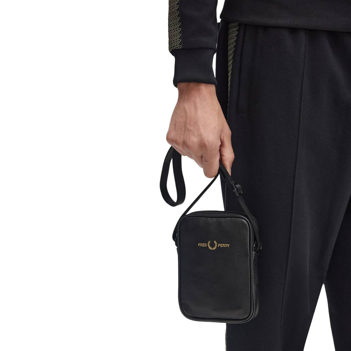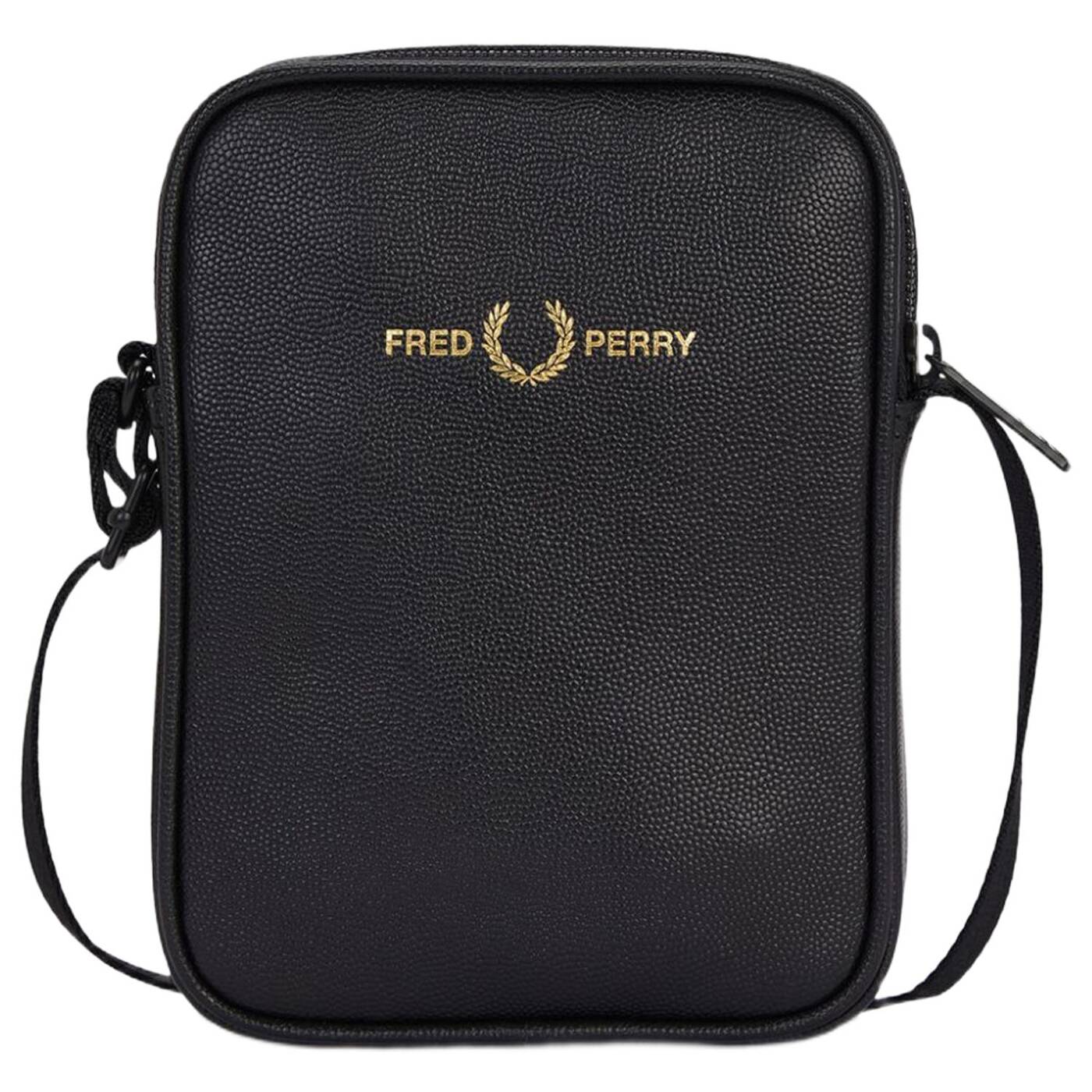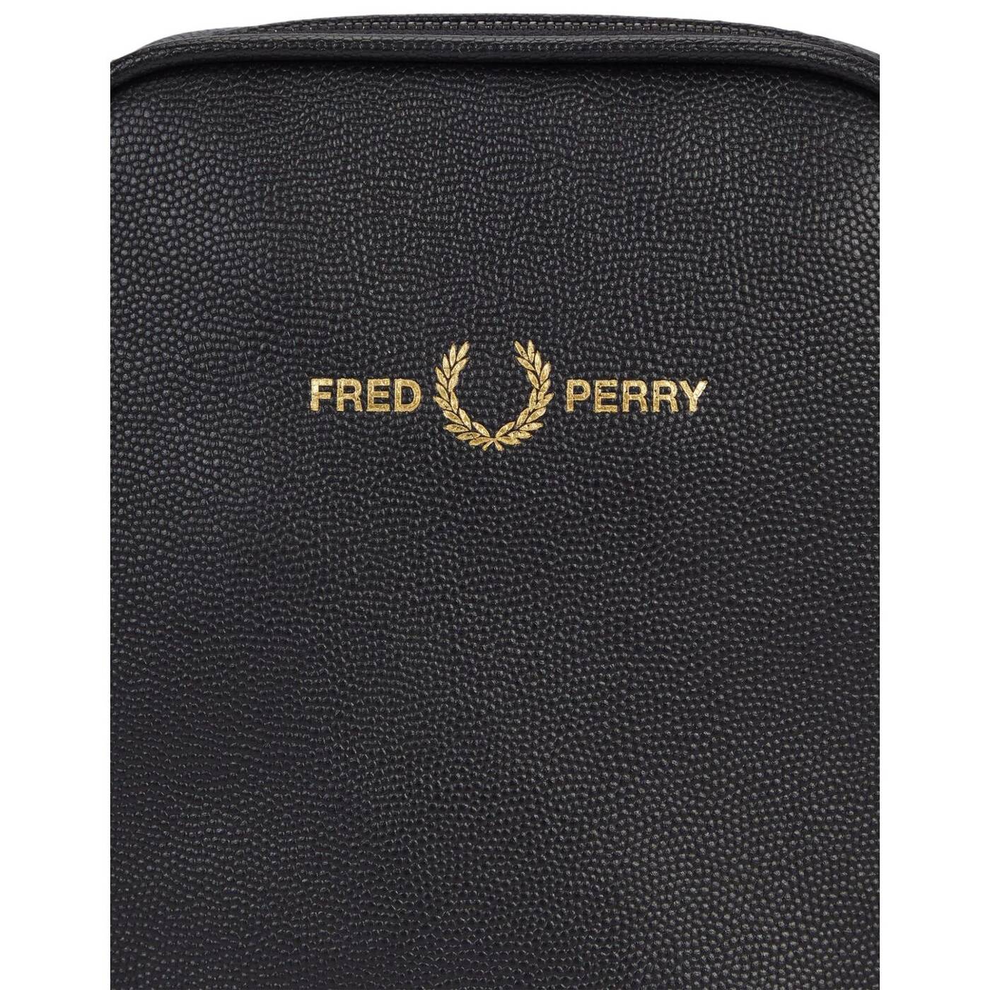 Scotchgrain-Leder / Verstellbarer Riemen mit glänzendem Fischgrätmuster / Innentasche / Mattschwarze Metallelemente / Geprägtes Fred Perry Logo in Gold auf der Vorderseite