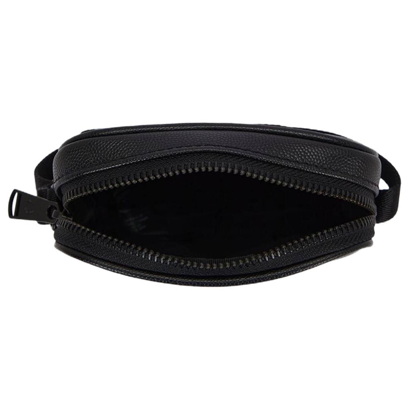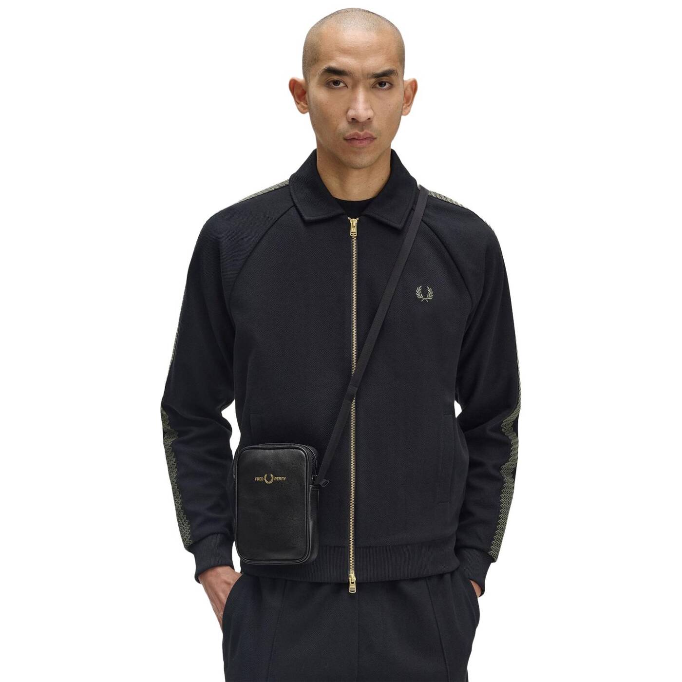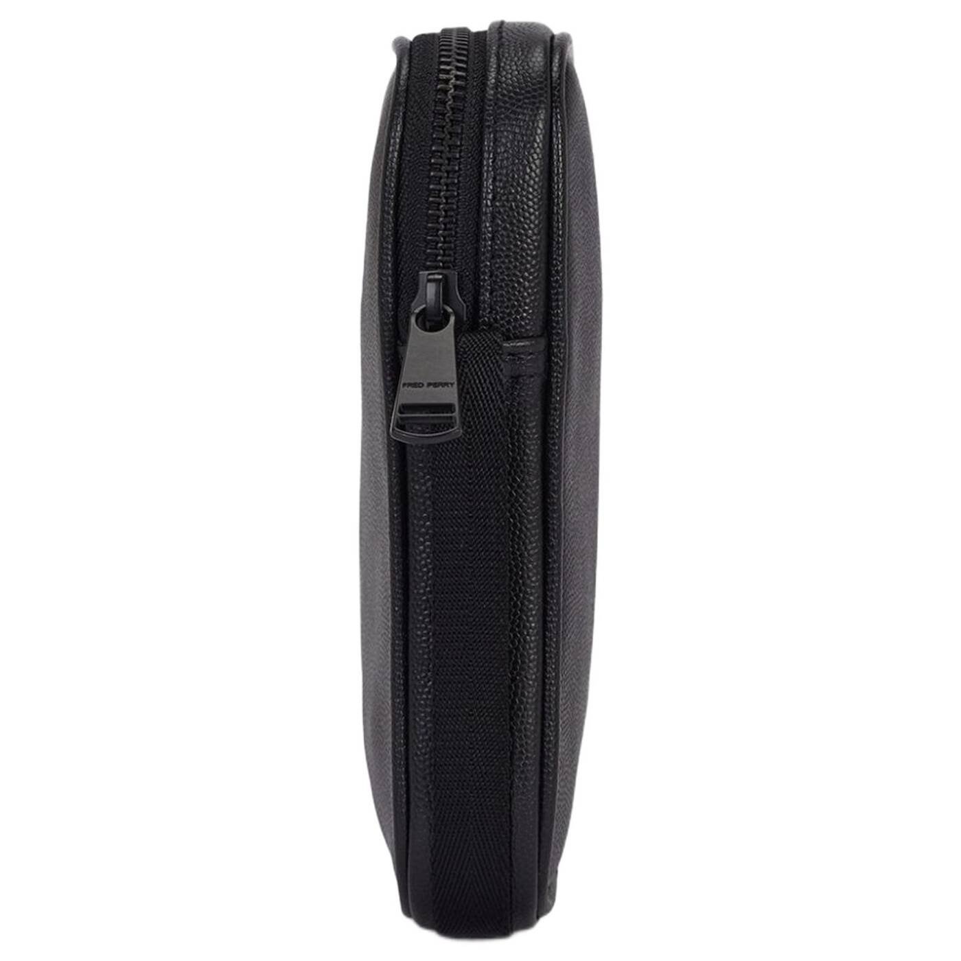 Scotchgrain-Leder / Verstellbarer Riemen mit glänzendem Fischgrätmuster / Innentasche / Mattschwarze Metallelemente / Geprägtes Fred Perry Logo in Gold auf der Vorderseite