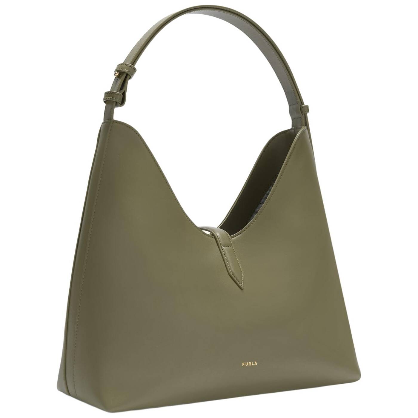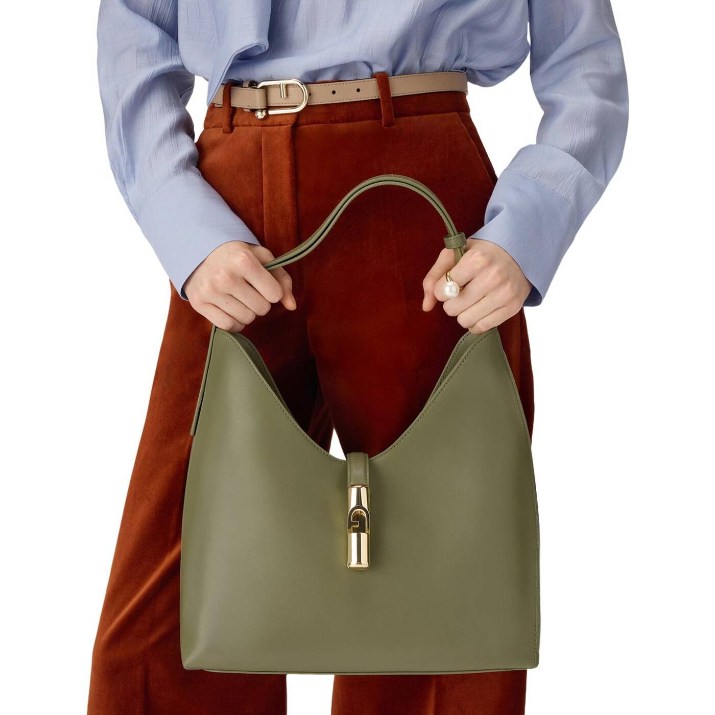 Die weiche Silhouette und die entspannte Struktur dieser Furla Goccia Hobo Bag verleihen ihr einen eleganten und modernen Akzent. Sie ist aus seidenweichem Leder gefertigt, das sich angenehm anfühlt, und bietet im Inneren genügend Platz für all Ihre wichtigen Dinge. Der neue zylindrische Beschlag, der an ein Gewicht erinnert und mit dem ikonischen Furla Arch-Logo verziert ist, verleiht dem passenden Riemen den letzten Schliff.