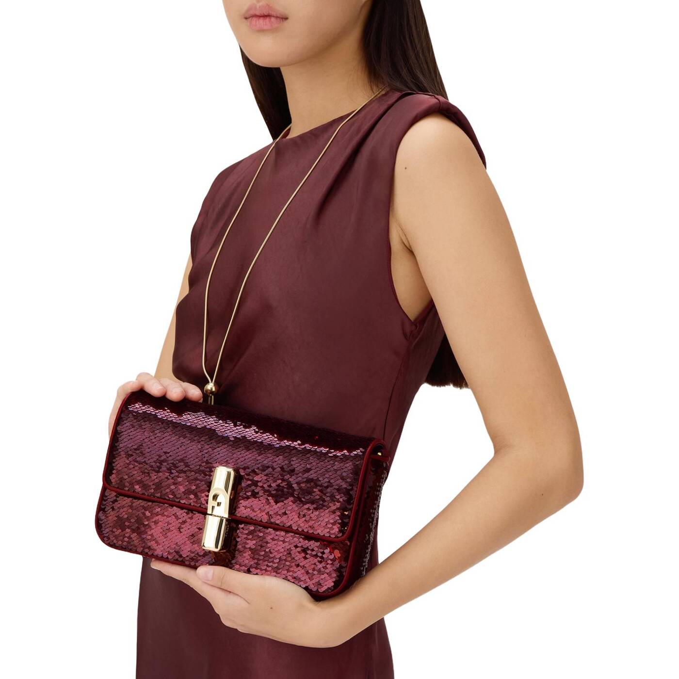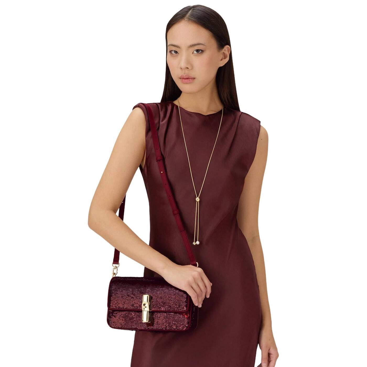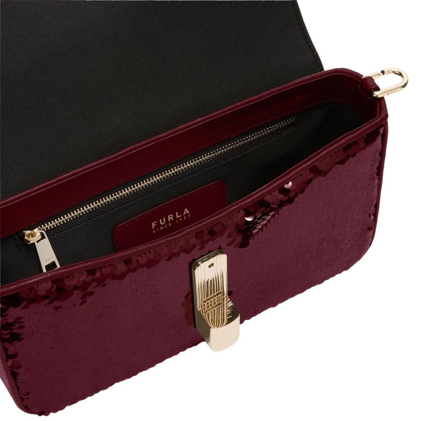 Vielseitig, zeitgenössisch und kompakt: Die Furla Iride Umhängetasche wird aus einem beschichteten Stoff mit eleganten, glitzernden Pailletten gefertigt und ist mit einem passenden, verstellbaren und abnehmbaren Schulterriemen für verschiedene Styling-Optionen ausgestattet. Der Magnetverschluss ist mit zylinderförmigen Metallbeschlägen versehen und mit dem ikonischen Furla Arch-Logo verziert.